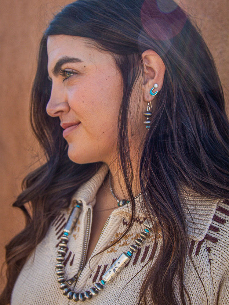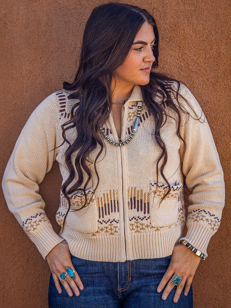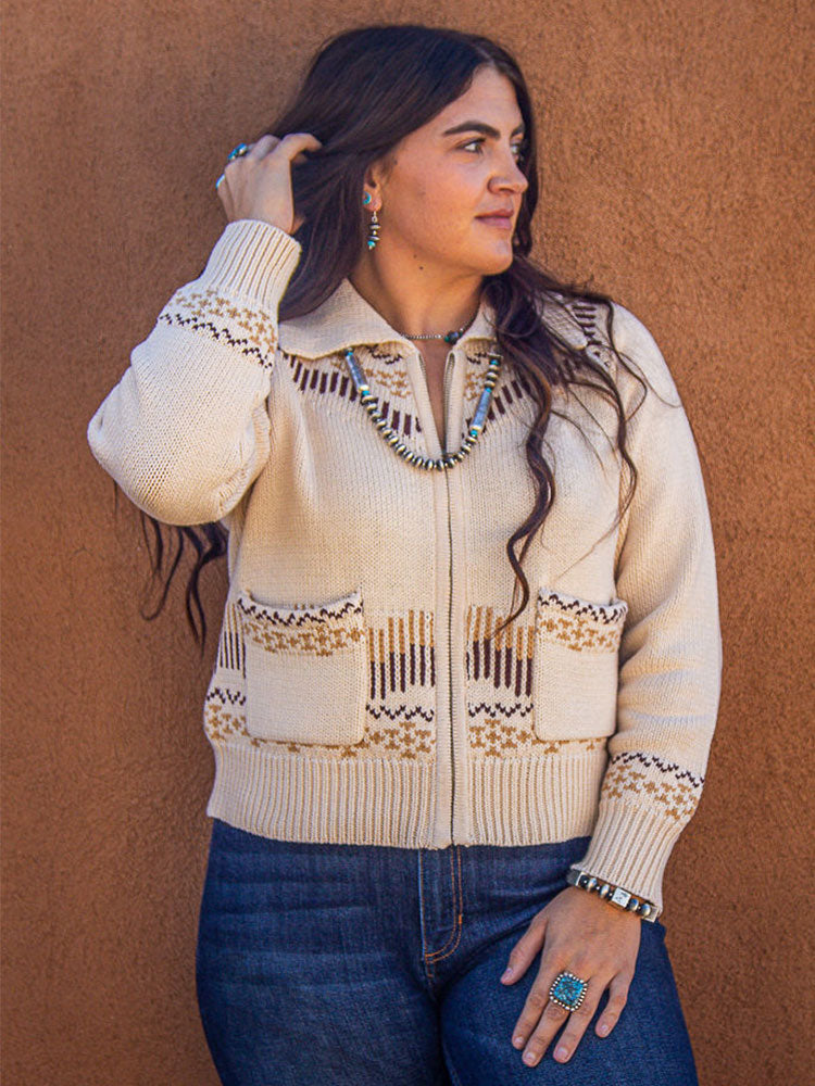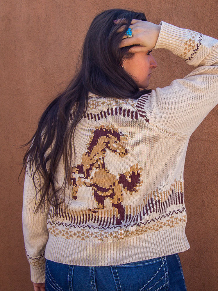 Buckin' Buckskin Zipfront Cardigan - Long sleeve collared creme cropped cardigan with ribbing along hem and cuffs. Cute front pockets, animated bucking horse on back and tan and brown geometries along edges. A great look!