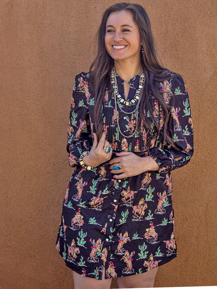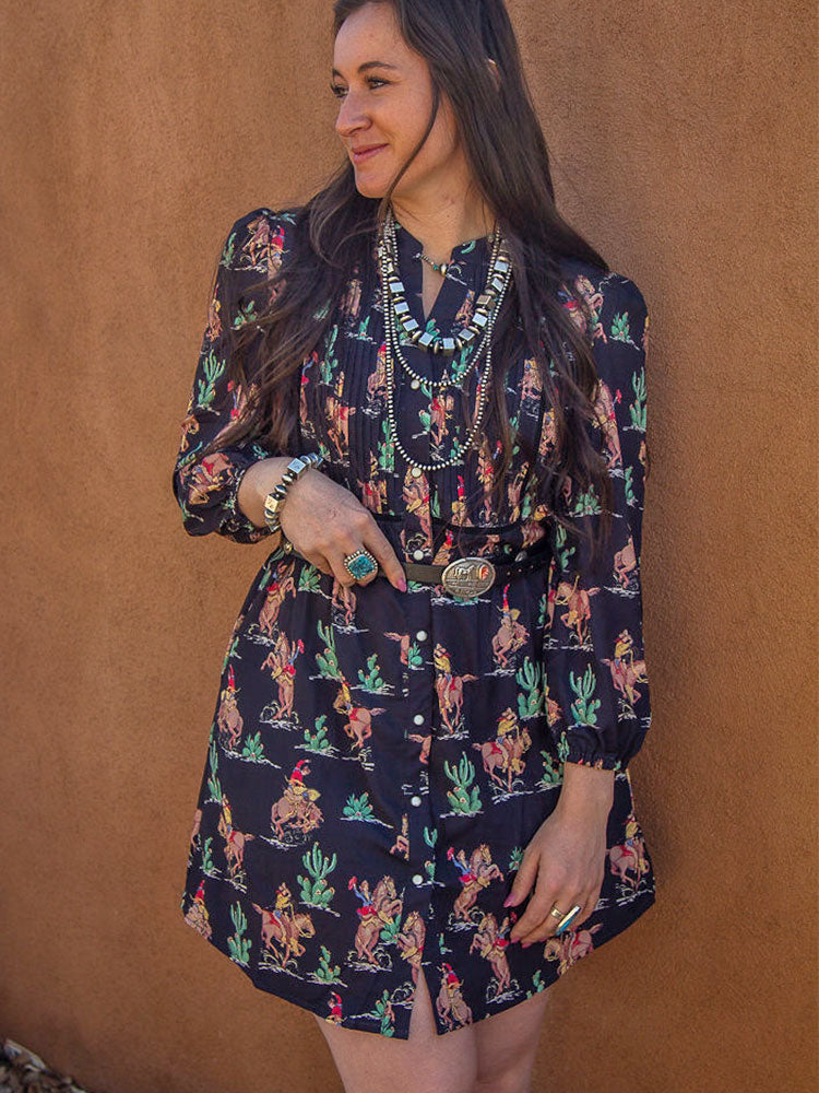 Cactus Print Dress - Really special! Long sleeve with little puffs at the cuff and shoulder lines, with pinwale detail and high waist outline in contrasting black, notch collar and total button up front. Rounded hem, and the cutest retro print! Could be ultra casual or just the dressup dress for that night out! (Belt shown on model is not part of the dress.)