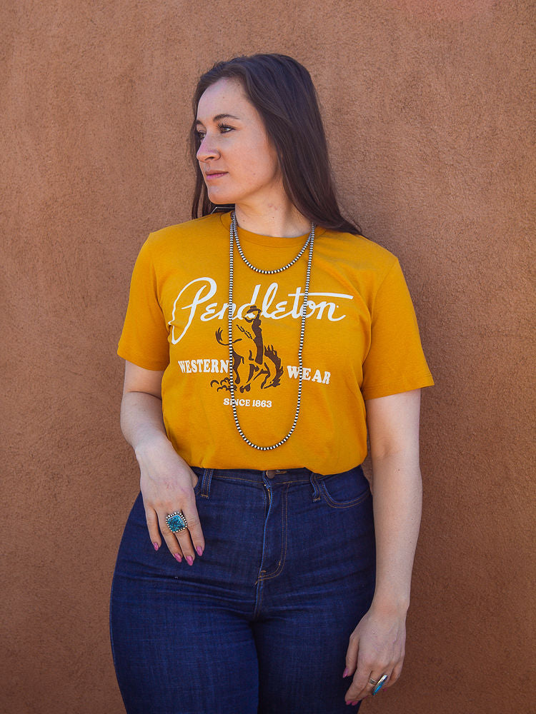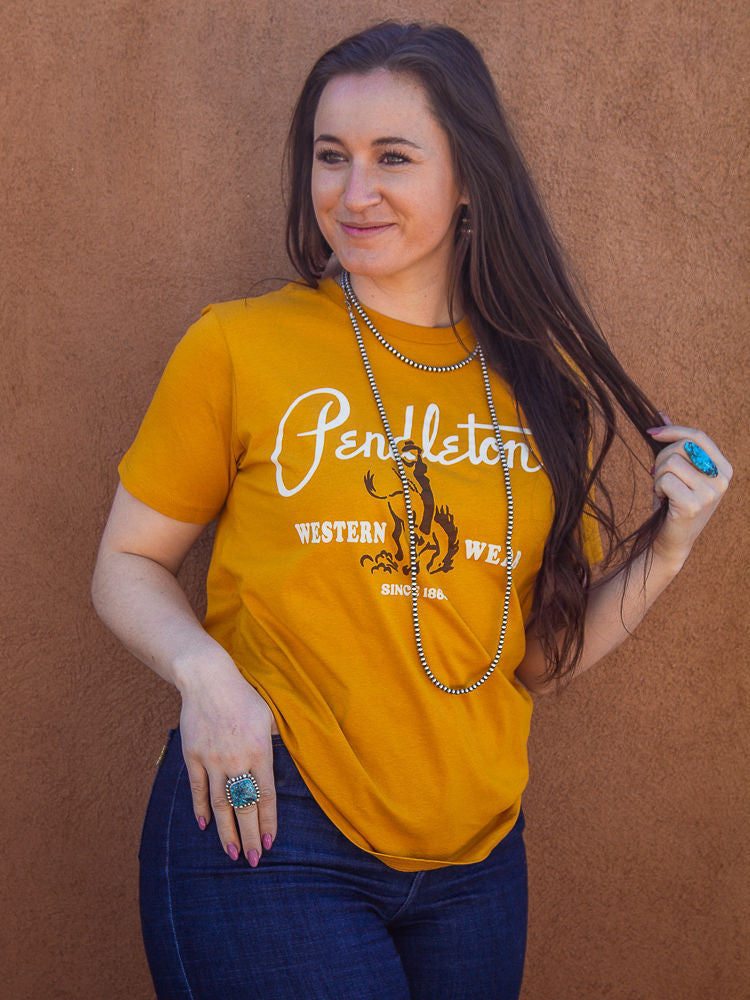 Cowgirl Graphic Tee by Pendleton - This sunshine golden graphic tee is part of Pendleton's heritage collection that celebrates the history of Pendleton. It is a soft ring-spun combed cotton tee that is perfect for those sunny summer days! (TB373-87424)