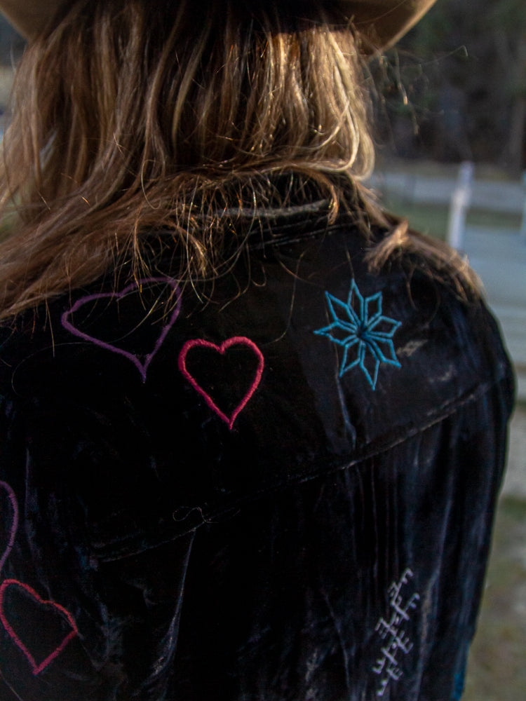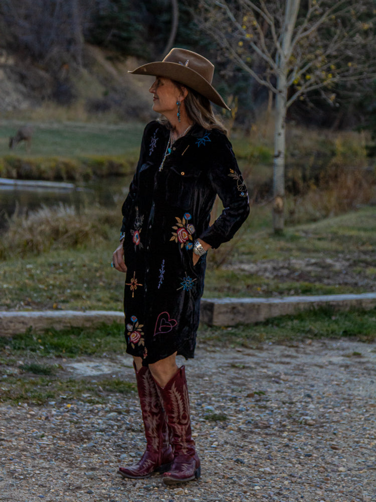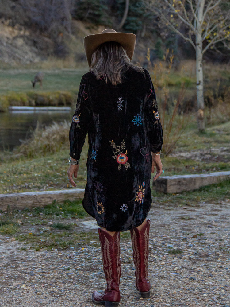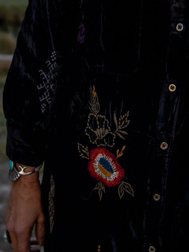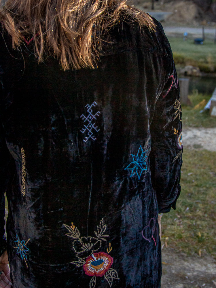 Kyla Seo Marlow Velvet Dress - this boldly black velvet dress with colorful patchwork flower stitches is so fun and one of our favorites! It is the perfect dress most occasions, it is great paired with boots or heels! (KSBH36)