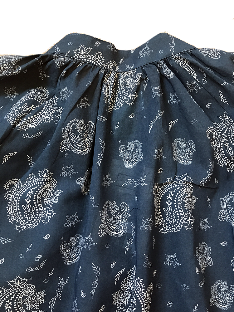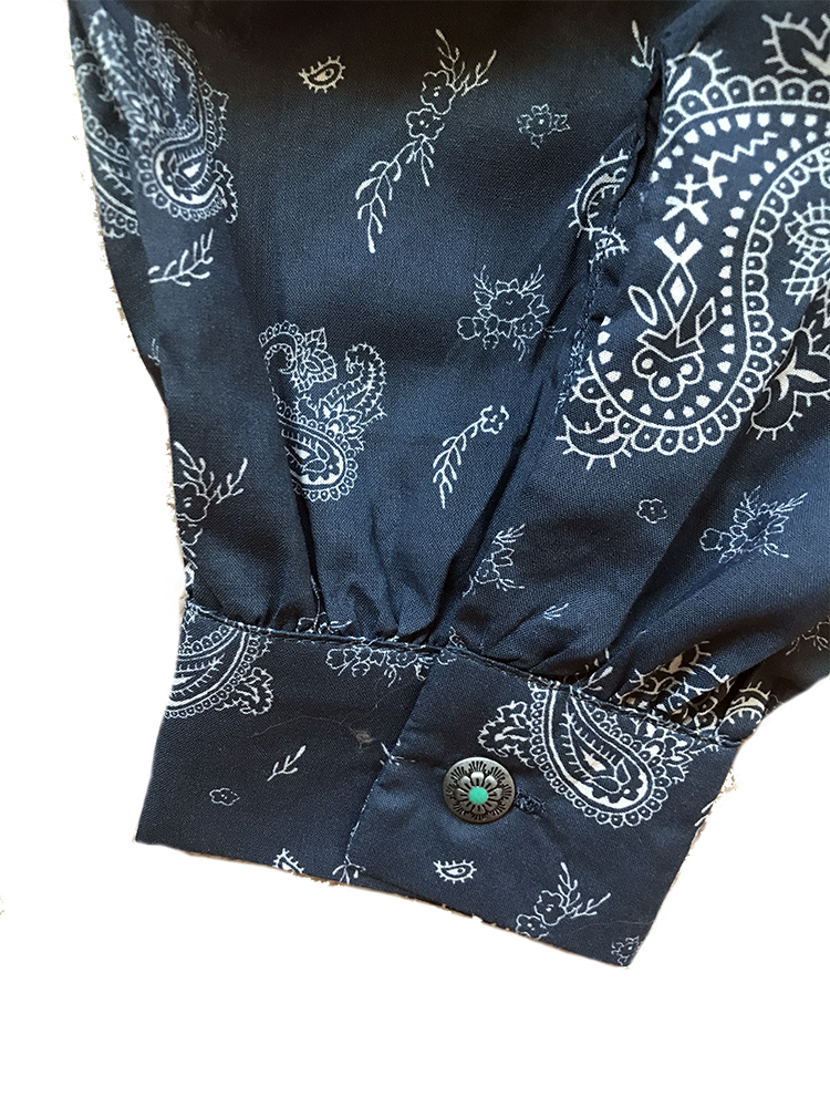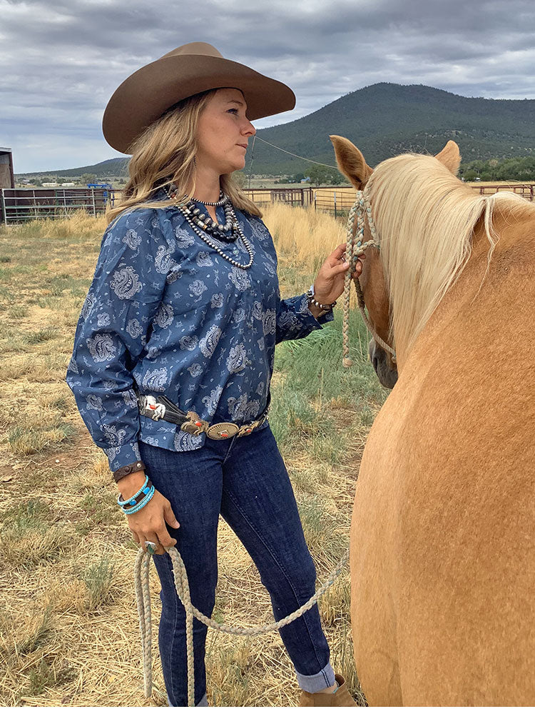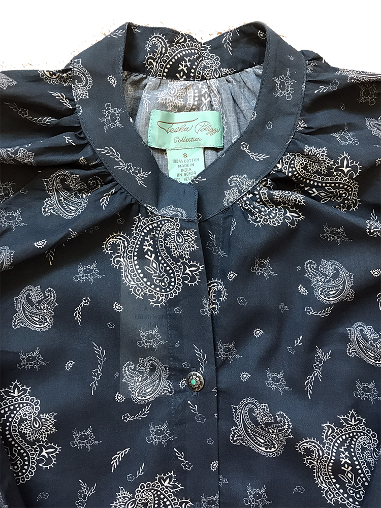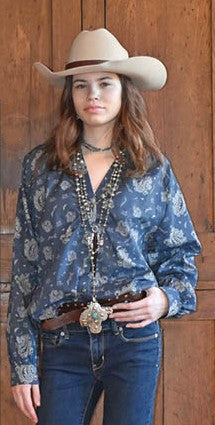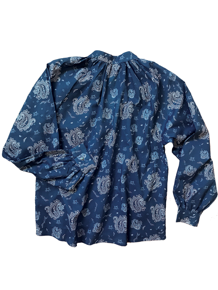 Maria Blouse by Tasha Polizzi, Fall 2024 Collection - MARKED DOWN! Printed with delicate white paisley on a teal-navy ground, this all cotton gathered-neck long sleeve blouse is a dream! With signature mini-concho buttons and straight hem. Button front. Layer away with this one, and have fun! (381109)