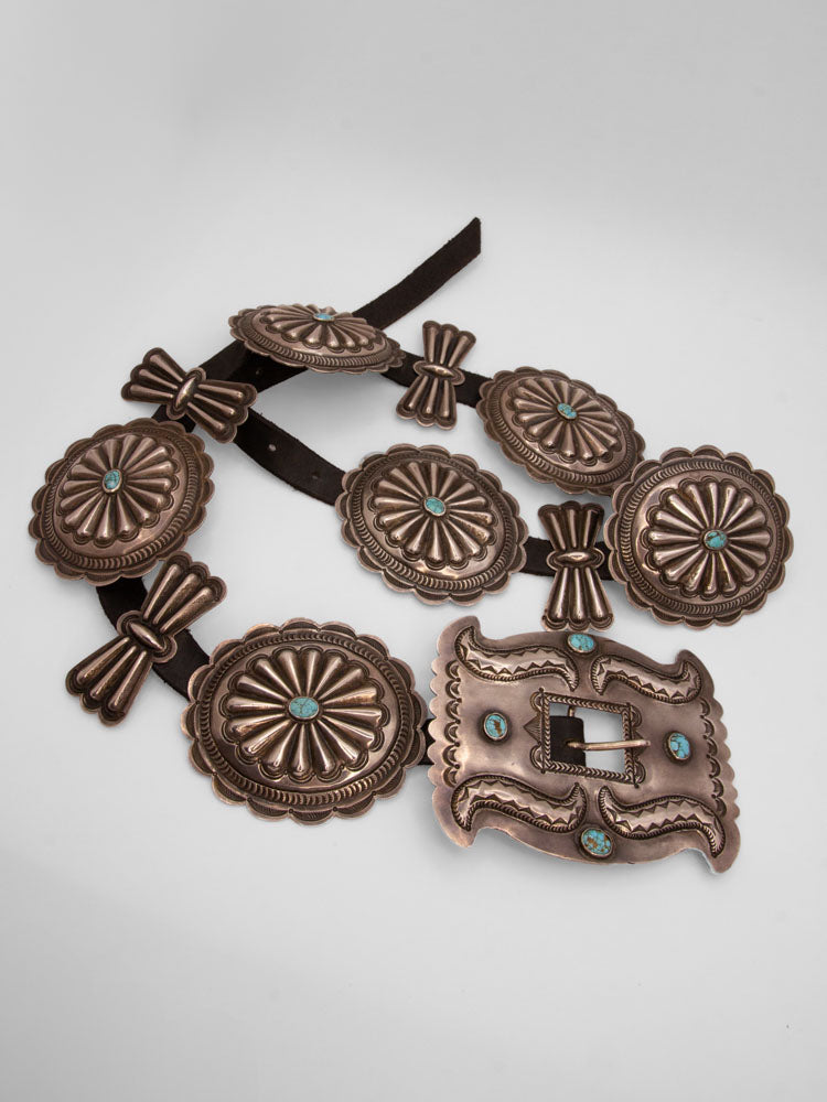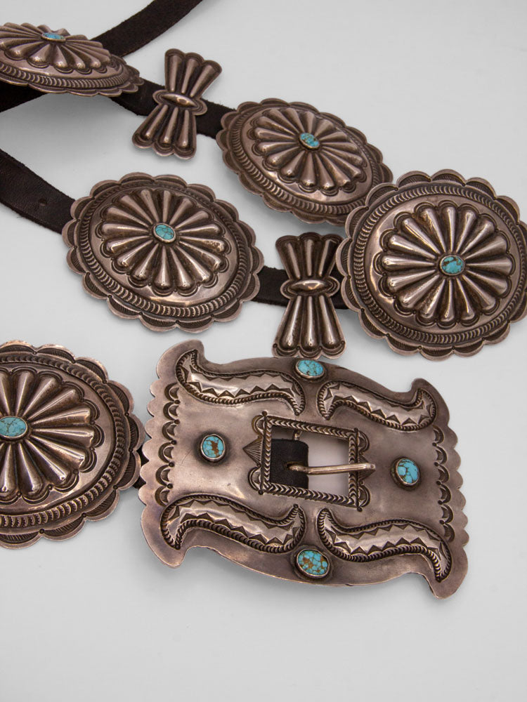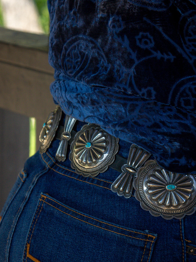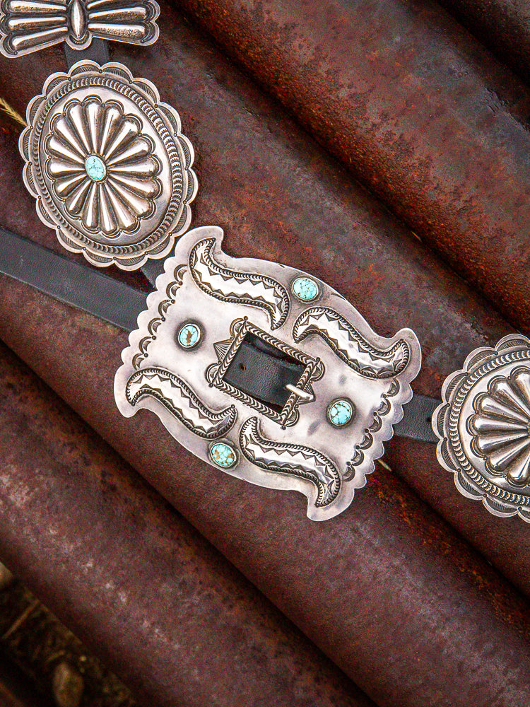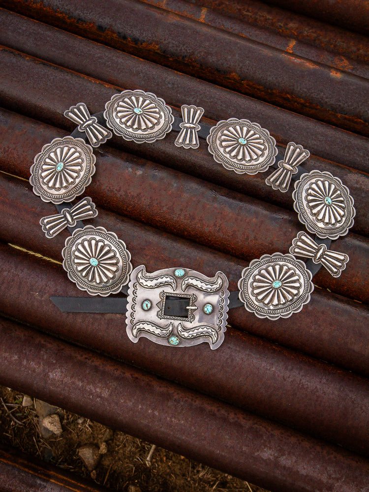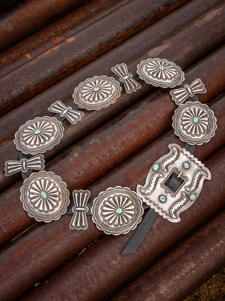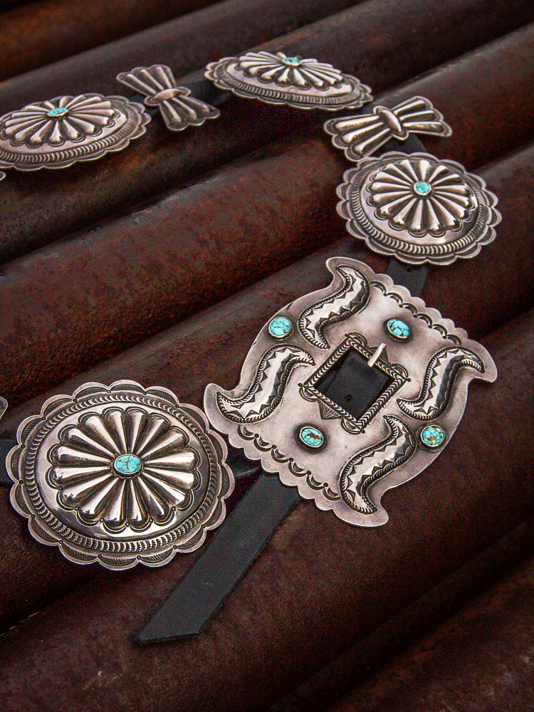 Vintage Turquoise Concho Belt - absolutely sunning vintage concho belt! This a one of kind piece that would be a wonderful addition to anyone's collection. This belt has six round conchos, five rectangle conchos, and a drop dead gorgeous buckle. The measures 42 inches long. All sterling silver with authentic turquoise and genuine leather.