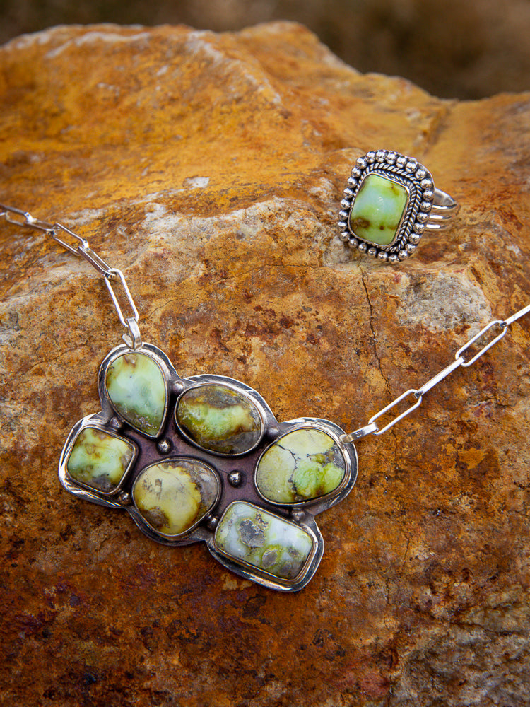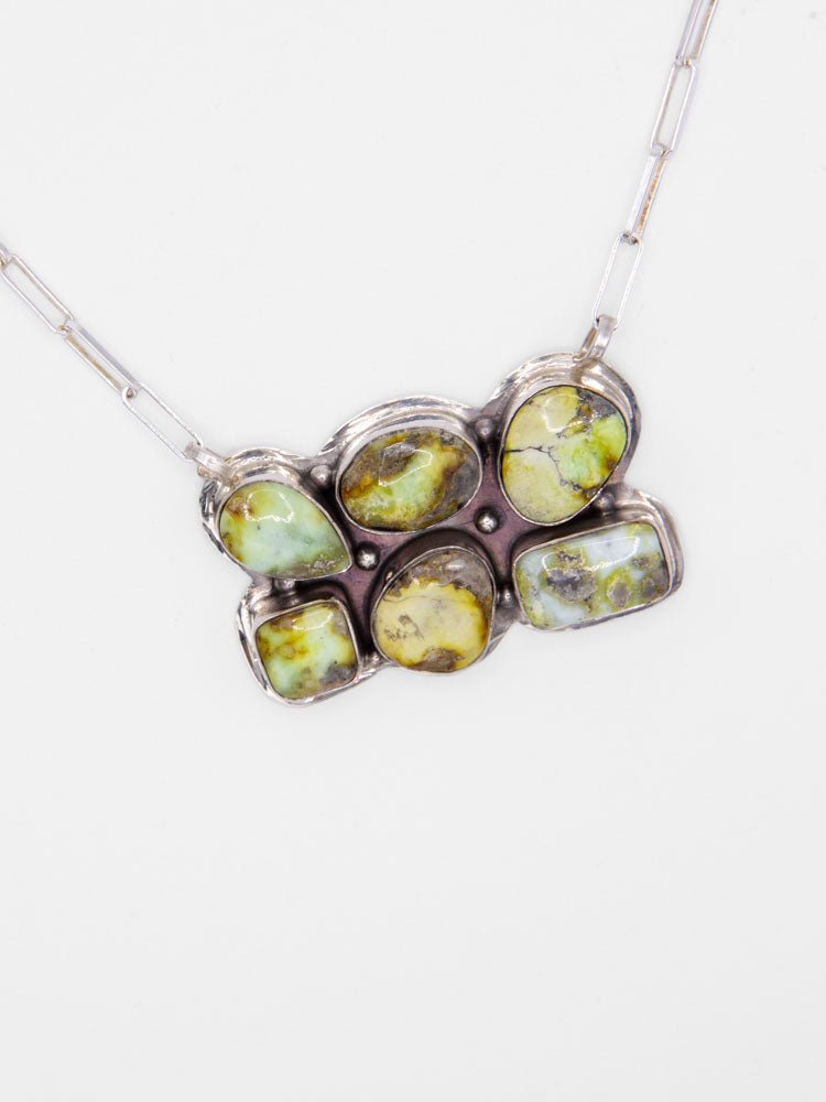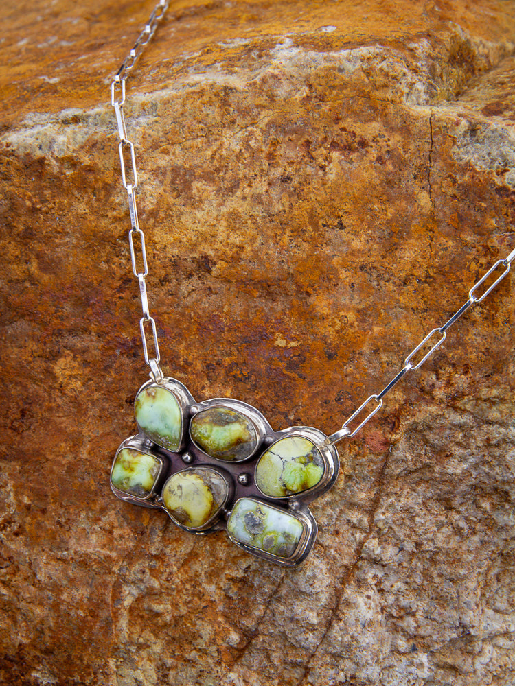 Palomino Bar Necklace - this is a Jewelry Lady Jr favorite, it is a beautiful palomino green bar necklace. It has six unique stones on a sterling silver chain with clasp to hang it. The perfect piece to layer with some Navajo pearls, turquoise, or simply by itself!