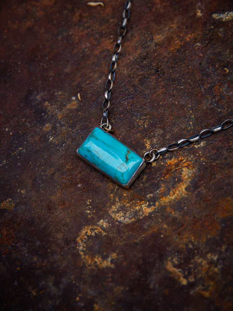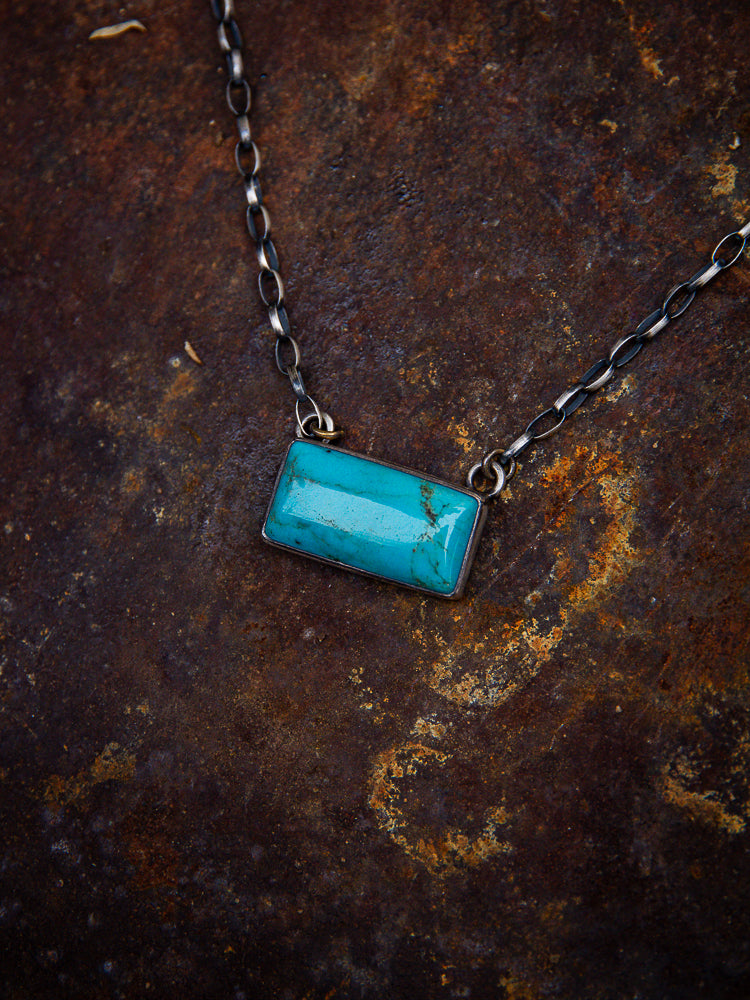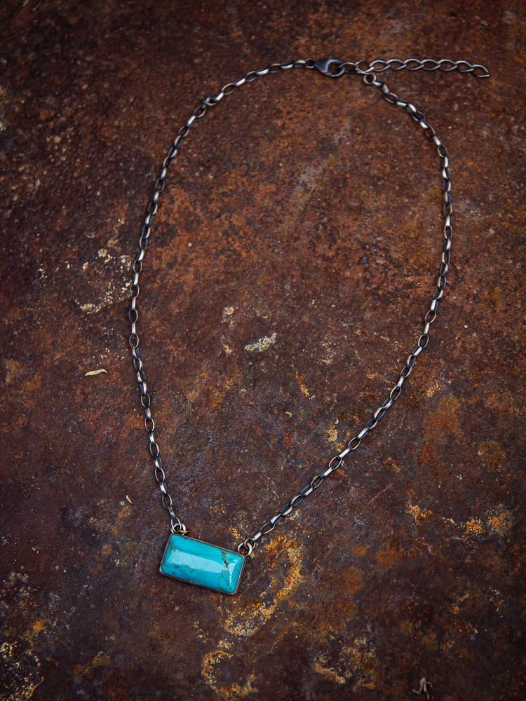 Benny Chavez Bar Necklace - this is the perfect bar necklace! Containing beautiful turquoise 3/4 inch bar on a hand made sterling silver chain hanging as long as 16”. Add to your layer collection today!