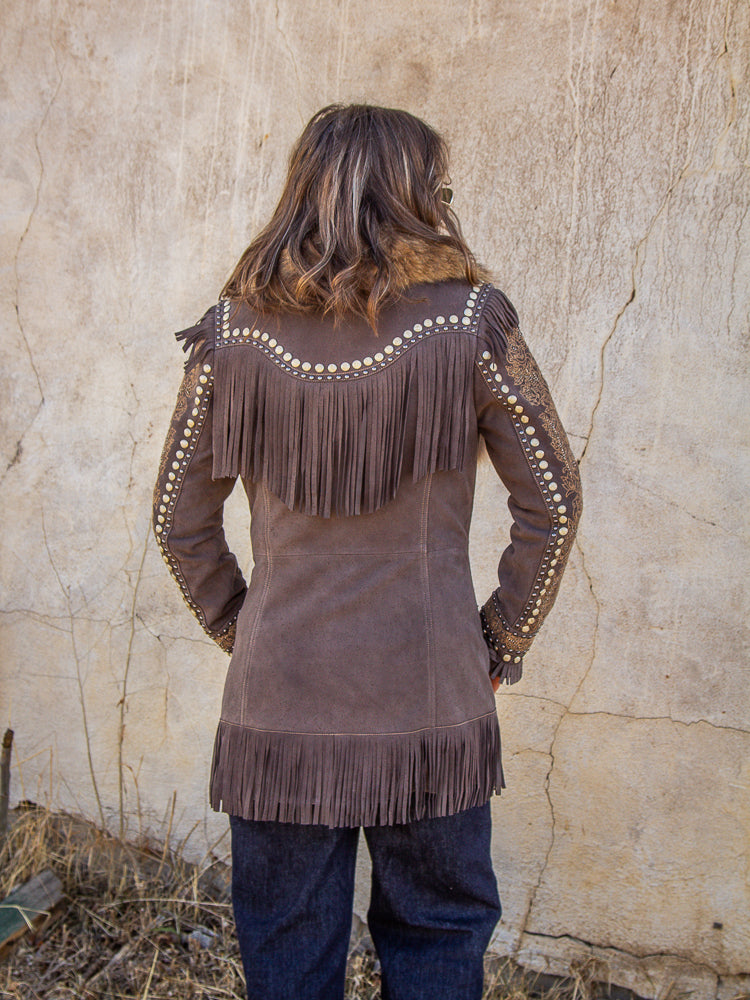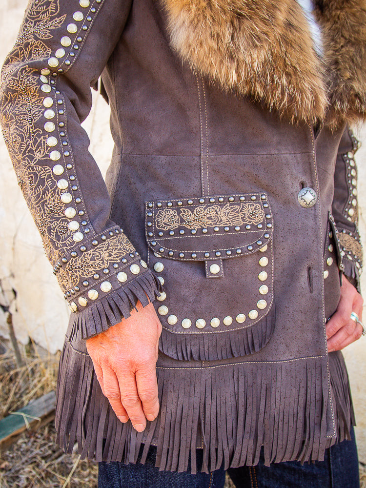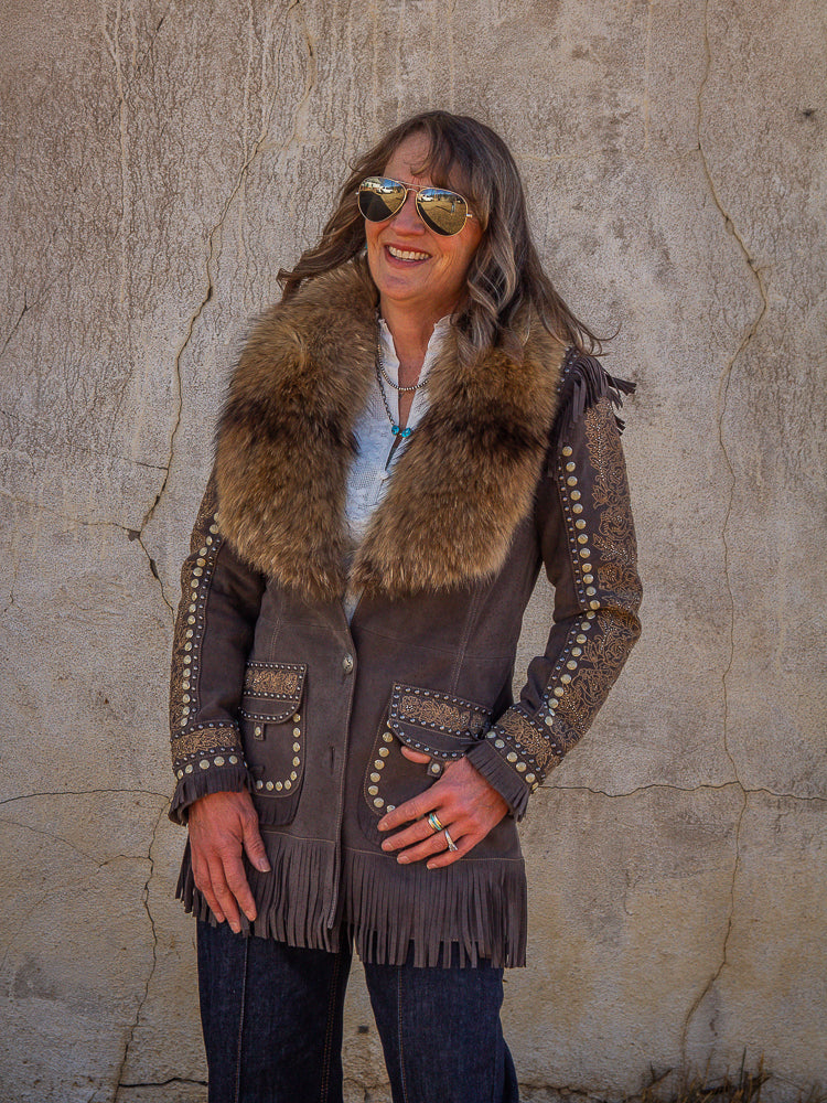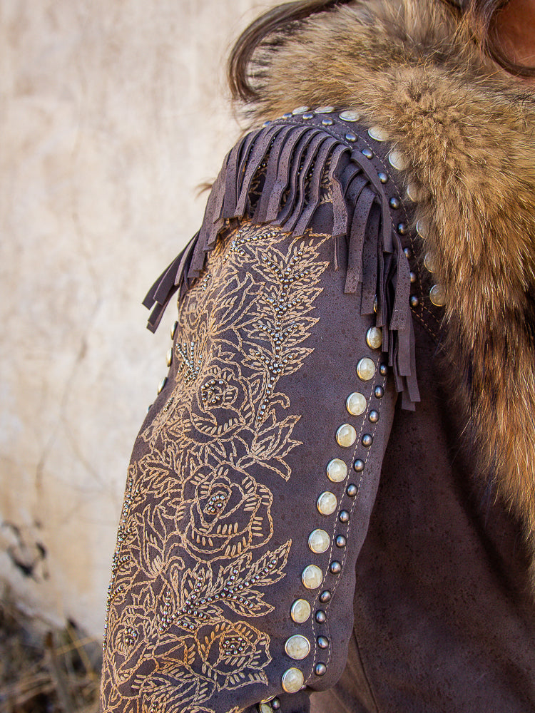 Regular price $1,400.00Horse Opera Coat by DDR - this a beautiful sheep suede jacket with fur on the collar. It is a timeless piece that can be passed from one generation's closest to the next! The collar is removable. It's a beautiful "bronco" color with timeless embroidery. This coat is apart of our ONE AND DONE sale, 20% off!! (C3443)