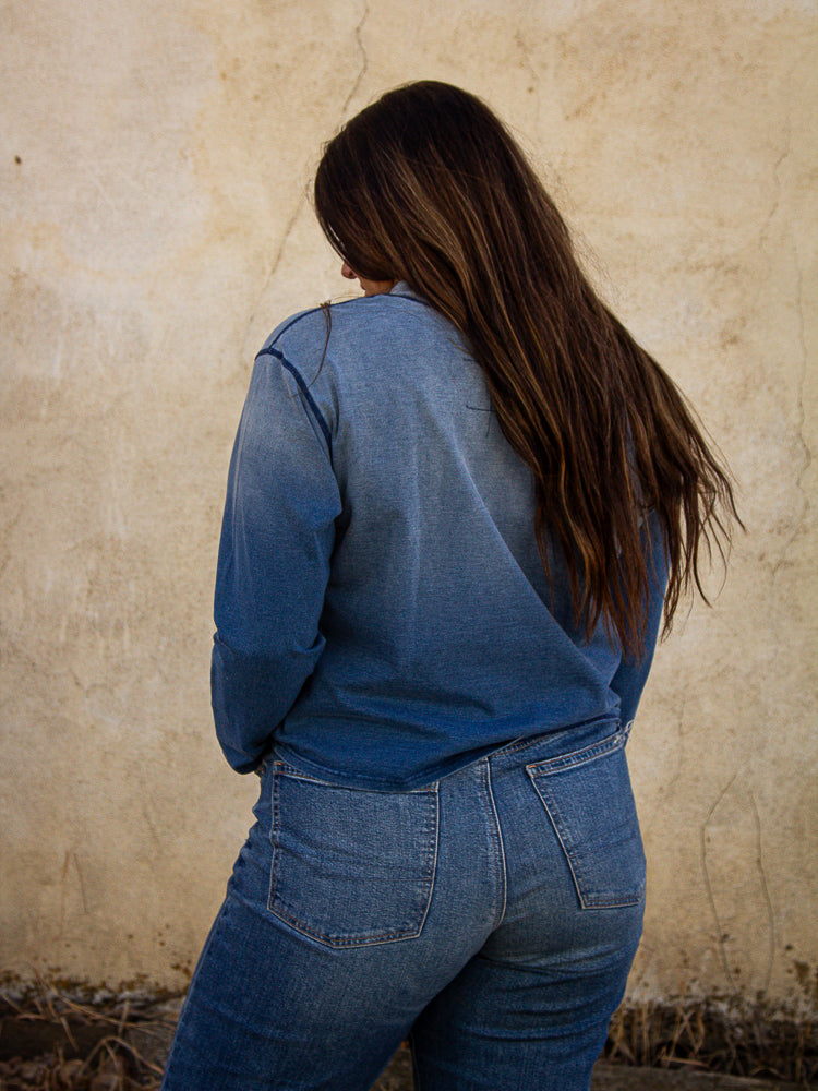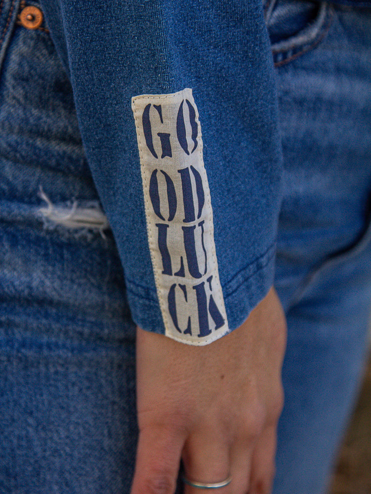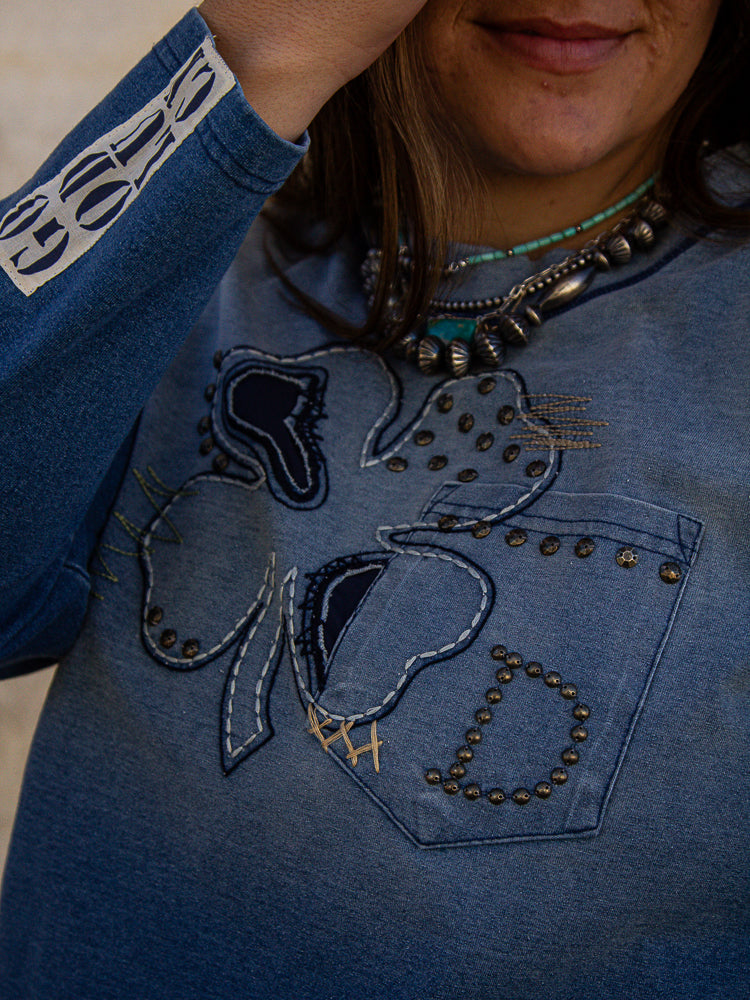 Lucky Charm Sweater by DDR - this is a Jewelry Lady Jr favorite, it is a calmy blue with stitching and buttons all across the front with a four leaf clover. It has fun patch work along the one arm and a cute pocket on the chest. This piece is also part of our ONE AND DONE sale, 20% off!! (T4120)