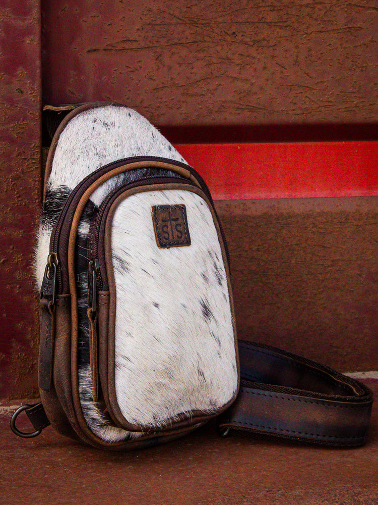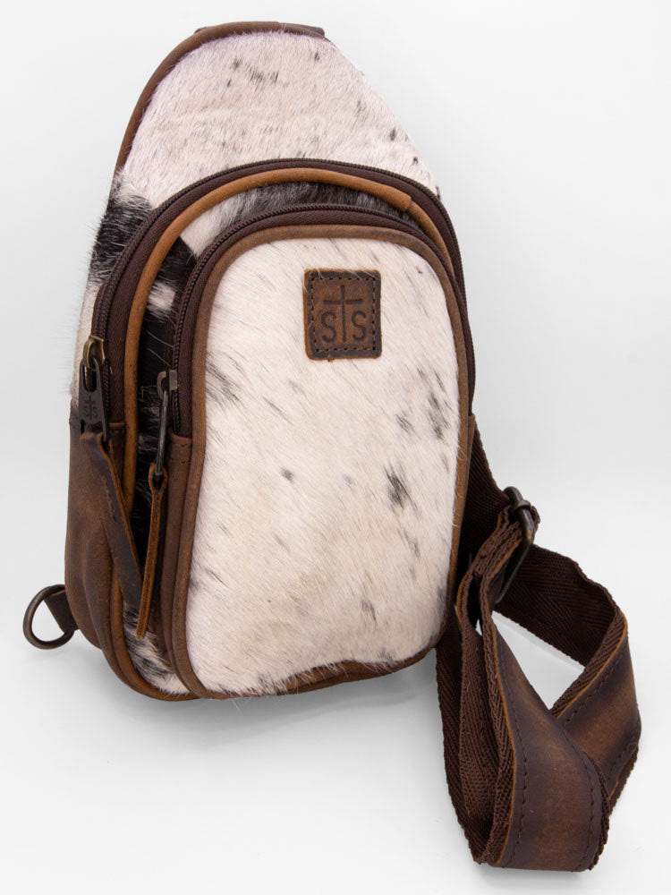 Cowhide Sojourner Sling - we love a fun cowhide slide to add to your favorite outfit! This sling has two large pockets to store all your belongings!