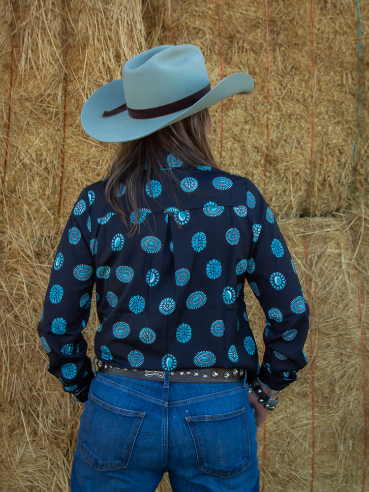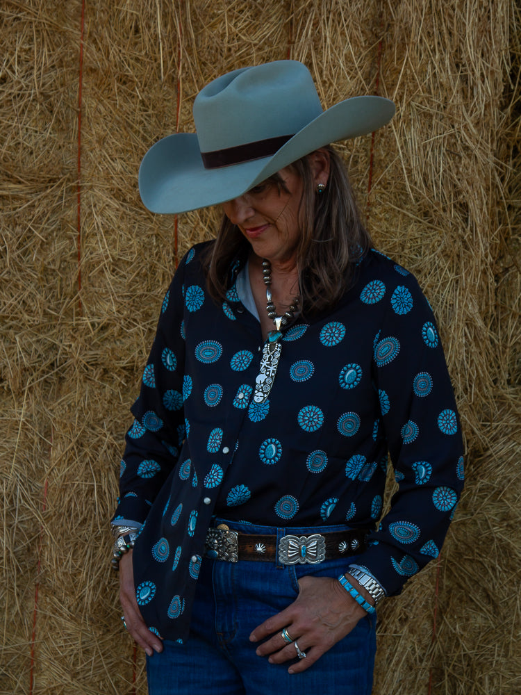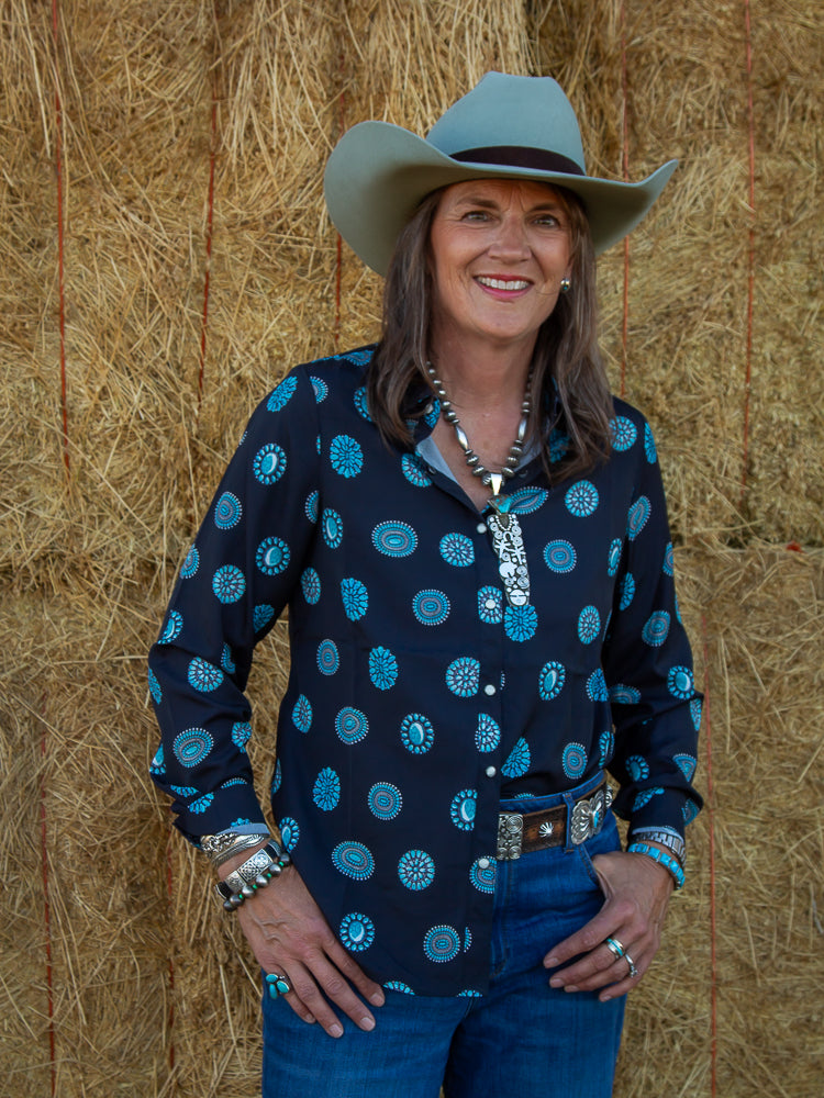 Navy Turquoise Cluster Shirt - getting ready for your next rodeo or even just another working cows or going into the office this button up is perfect to show your love for turquoise! This fun top has fun turquoise cluster designs with white buttons to tie it all together.