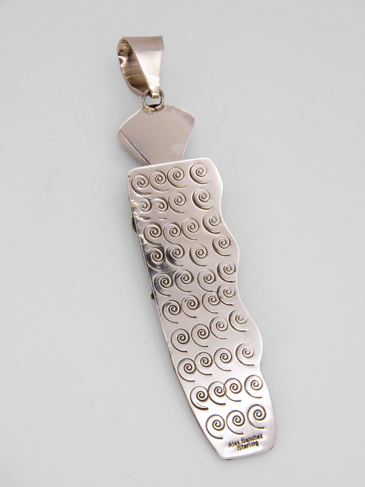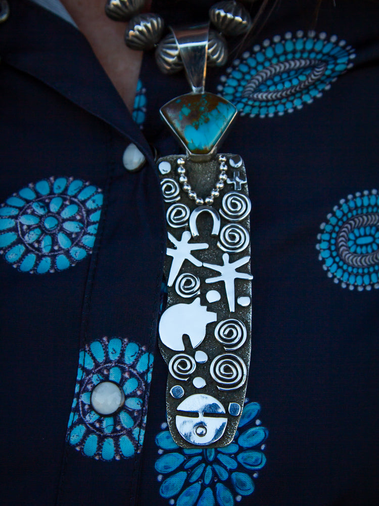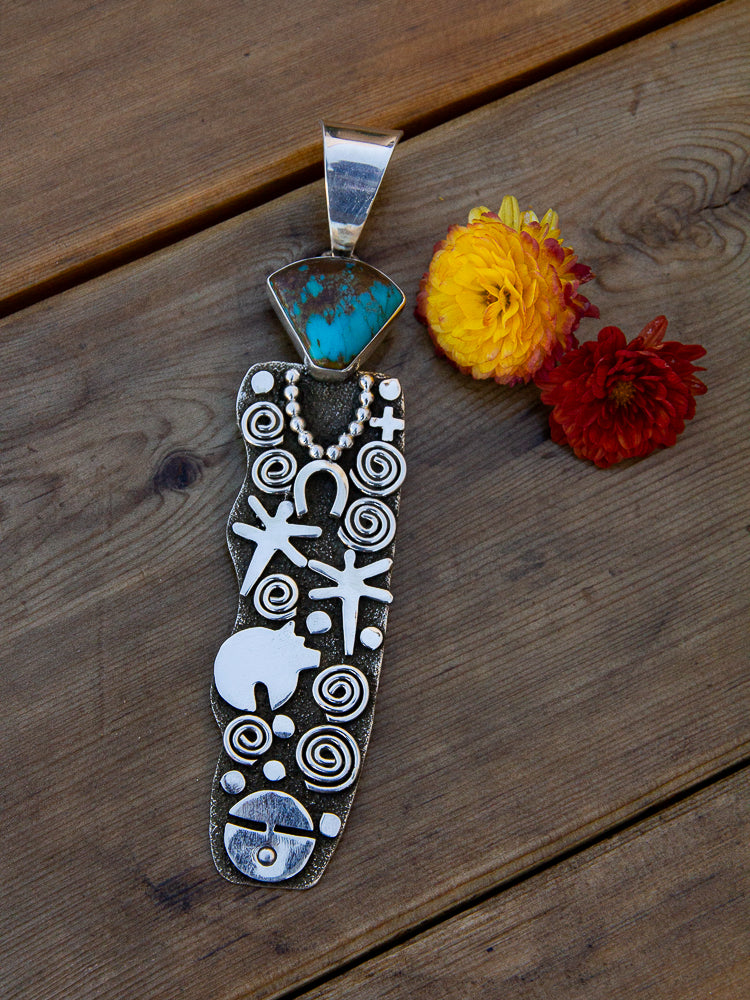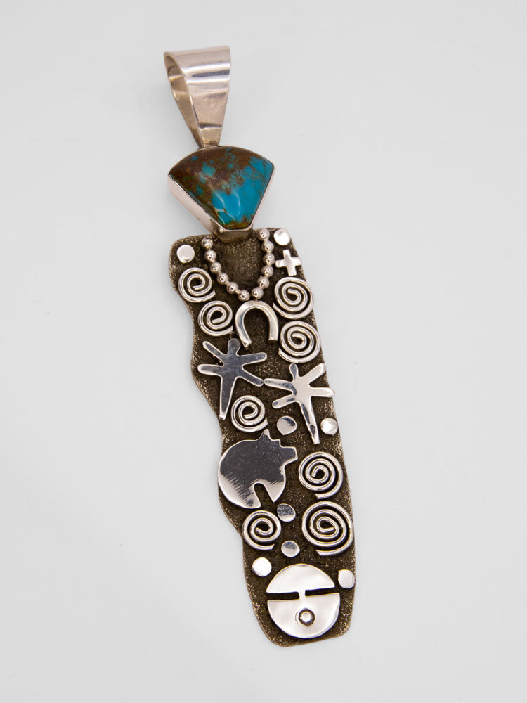 Storyteller Pendant by Alex Sanchez - one of a kind story telling pendant by the amazing Alex Sanchez. Alex was born in 1969 and is Navajo and Zuni. He chooses every character very carefully and they represent many petroglyphs. This beautiful piece is topped off with a unique turquoise stone on the top.