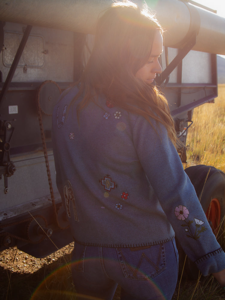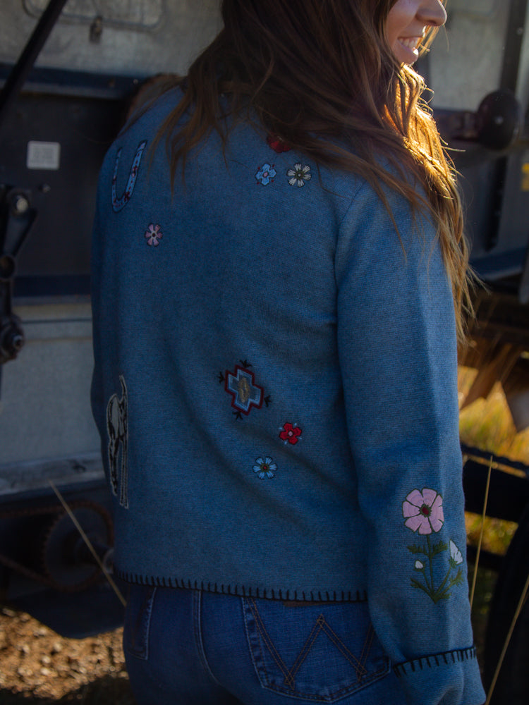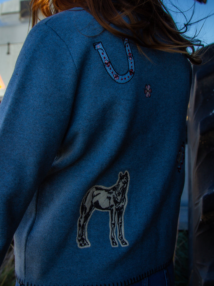 Western Souvenir Sweater by Pendleton - this sweater shows the western lifestyle all throughout the sweater like horses, boots, wildflowers, horseshoes, etc. This beautiful navy sweater has wonderful black buck stitching with stamp silver buttons to top it all off. 100% wool