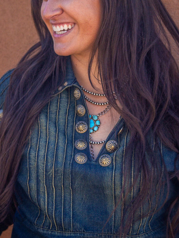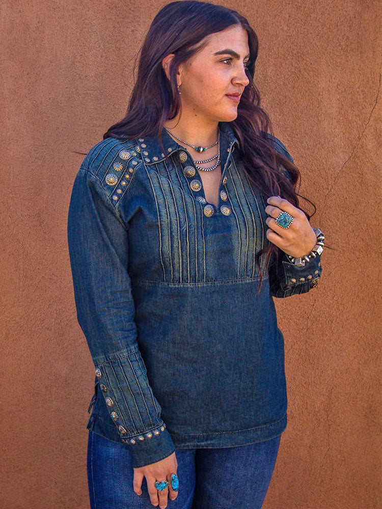 Washed Dark Denim Navajo Shirt Tunic - Really special! V collared neckline flanked by large conchos. Pinwale detail on bodice, shoulder, and lower arm, peppered with even more smaller conchos sewn on everywhere! This style works great on every body type and looks so flattering.