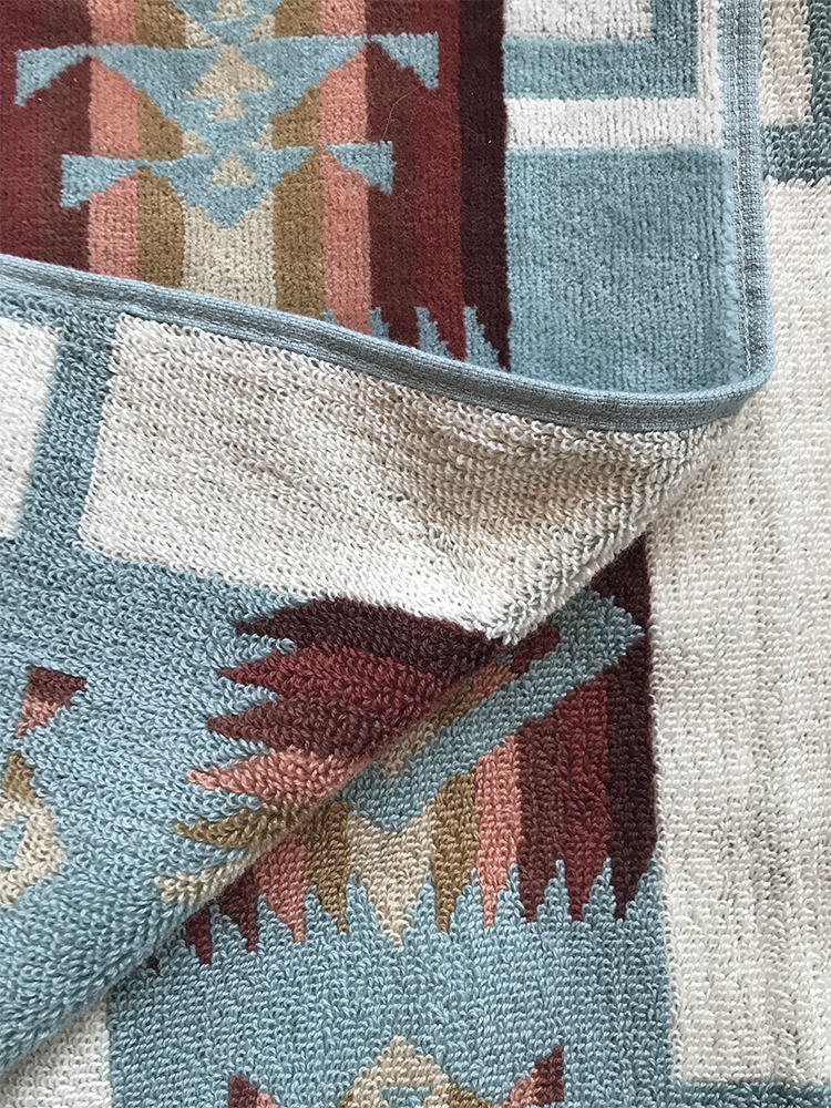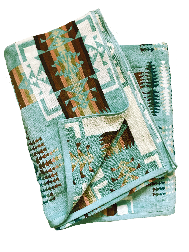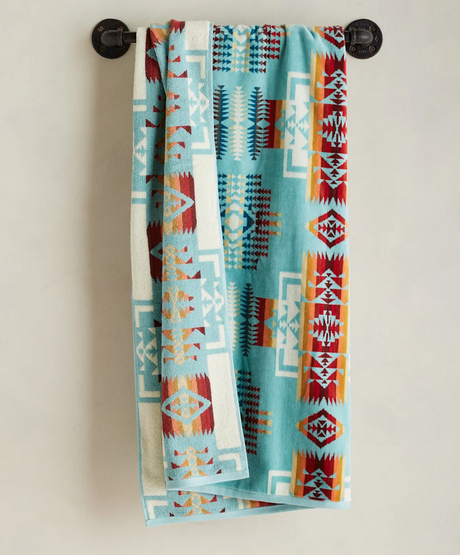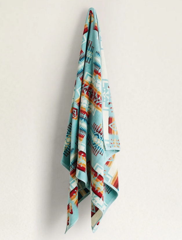 Chief Joseph Aqua Spa Towel by Pendleton - Pendleton rocks! Supersized towel woven of cotton velour in vivid colors that stay true, wash after wash. Sheared on one side for softness, looped on the other for superior absorption. A luxury you'll love for the beach, hot tub, or pool. Measures 40" x 70". These towels are made following environmentally-friendly standards and under safe, socially responsible working conditions as certified by OEKO-TEX®.