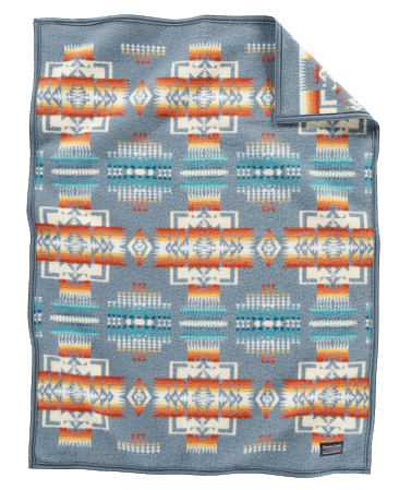 Chief Joseph Muchacho Crib Baby Blanket by Pendleton, Slate - Give the next generation an heirloom in Pendleton's longest ongoing blanket design, woven in their Pacific Northwest mills for nearly 100 years. A portion of sales from all Pendleton merchandise using the Chief Joseph pattern goes toward yearly grants to nonprofits supporting Native American language preservation, and to support Native Americans who seek careers as healthcare professionals. Made in America of softest pure virgin wool with cotton, this baby blanket is a treasured gift (and customizable with embroidery for a personal touch). Reverses for two different looks. Measures 32" x 44". Napped; fabric is combed for a softer, thicker feel with felt binding. Dry clean.