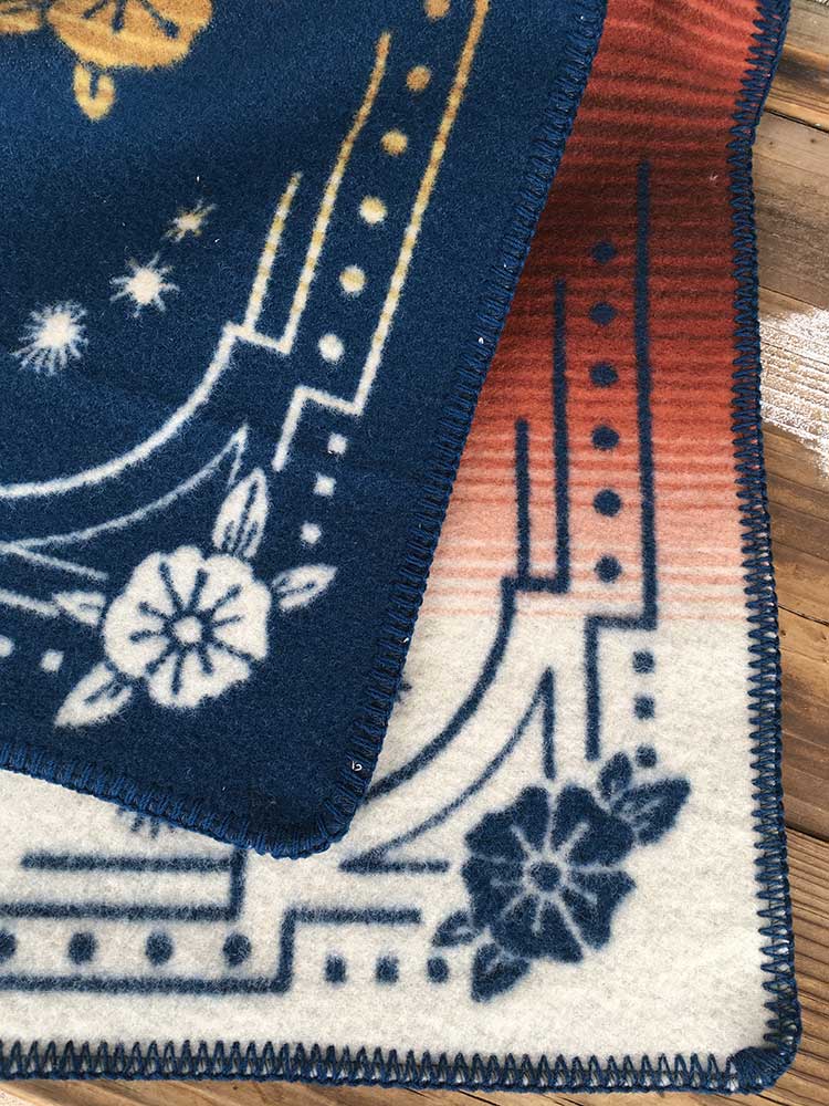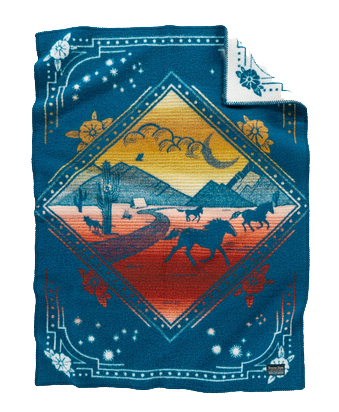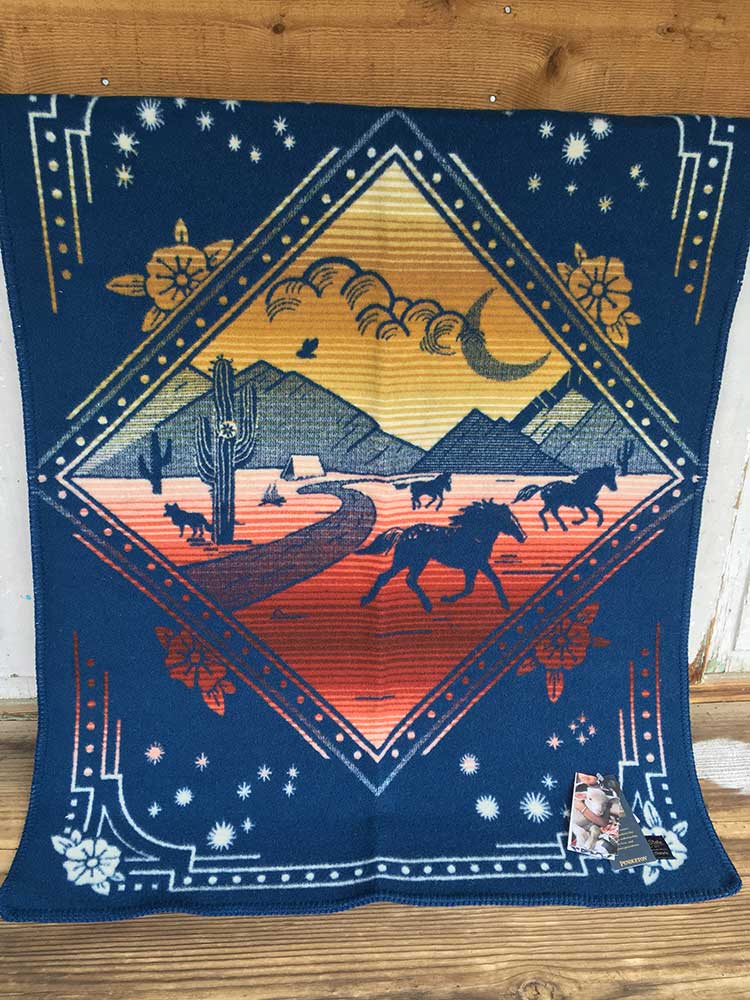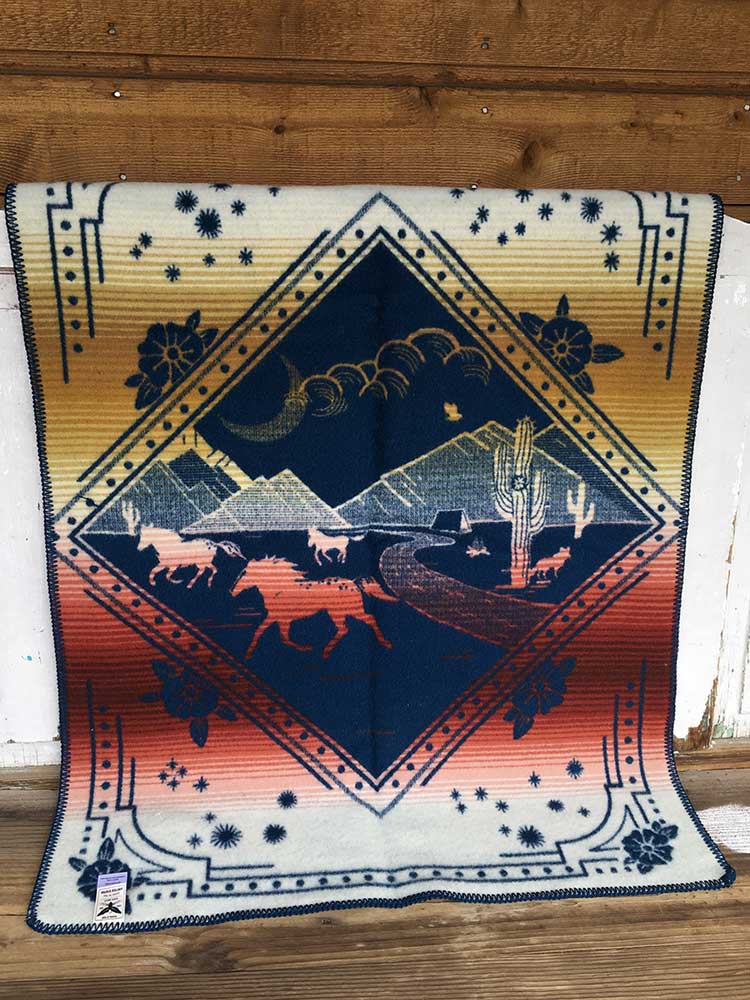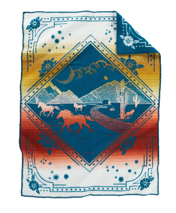 "Wind Riders" Muchacho Crib Baby Blanket by Pendleton - Pendleton rocks! Woven in a design of a desert at night, with a stallion, mare and colt galloping fast and free under the starry sky. Made in America of softest pure virgin wool with cotton, this baby blanket is a treasured gift (and customizable with embroidery for a personal touch). Reverses for two different looks. Measures 32" x 44". Napped; fabric is combed for a softer, thicker feel with whipstitch binding. Dry clean.