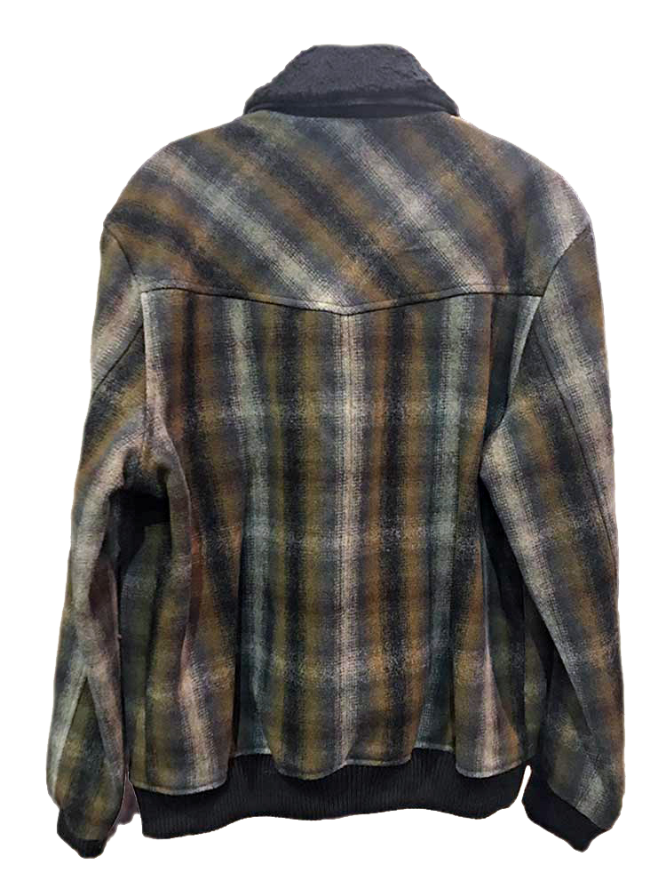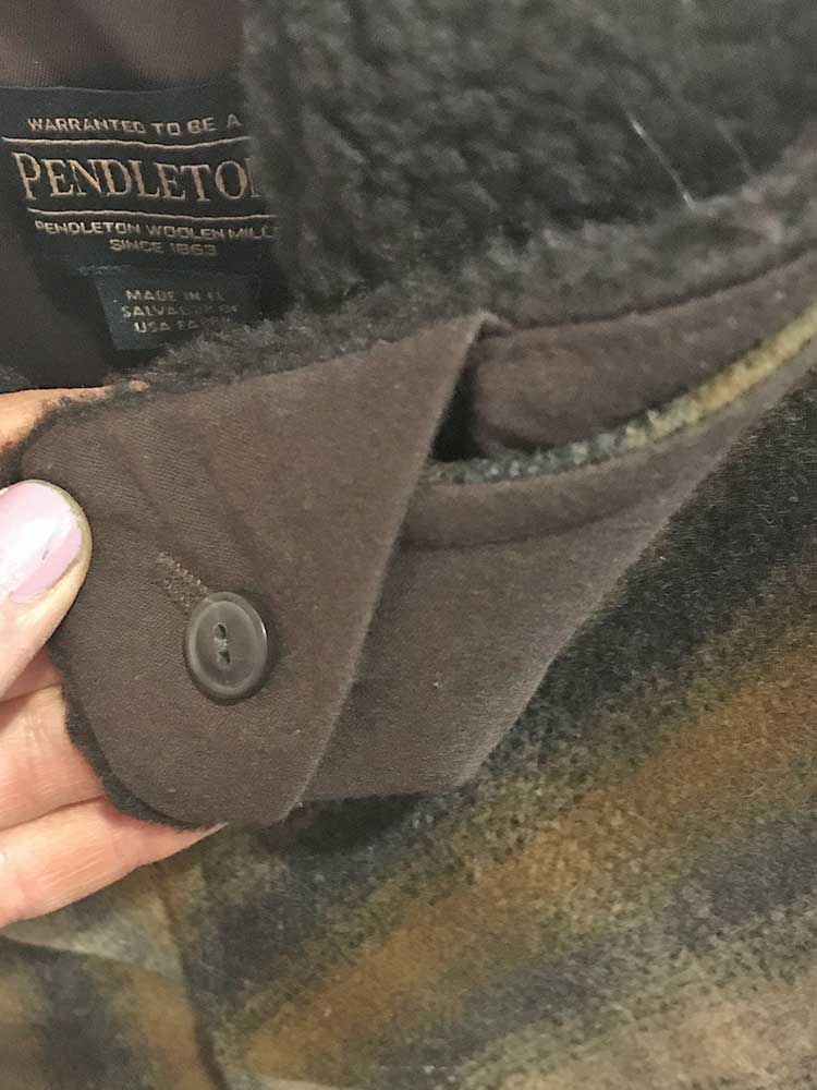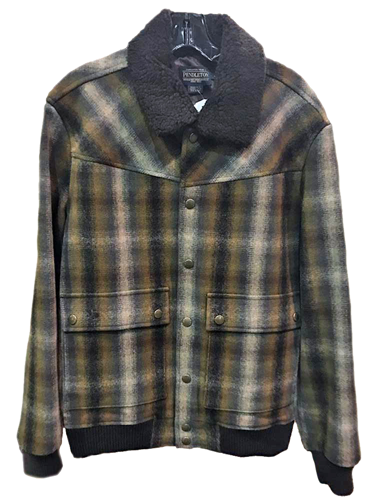 Brown + Olive Plaid Wool Coat by Pendleton - Classic Pendleton! MARKED DOWN AGAIN! This durable coat is made from rich wool and features a plaid pattern and plush faux-shearling brown collar (removable) for a truly cold-weather-ready look. Ribbed cuffs and hem. Pattern is diagonal on upper yoke, front and back. Big roomy square pockets in front. Zip and snap opening.