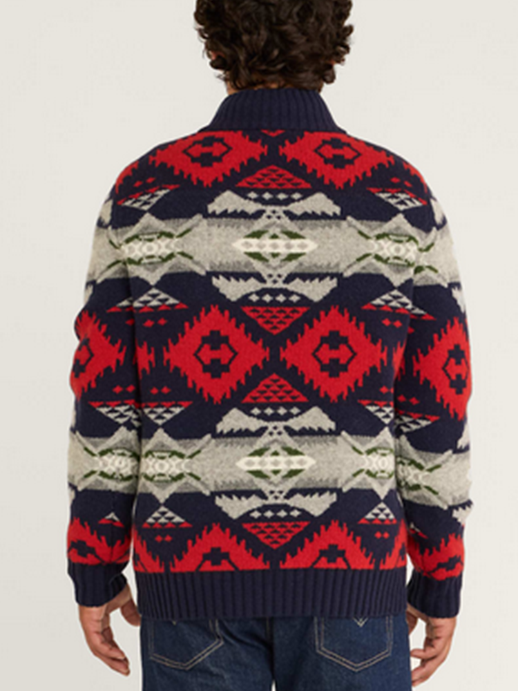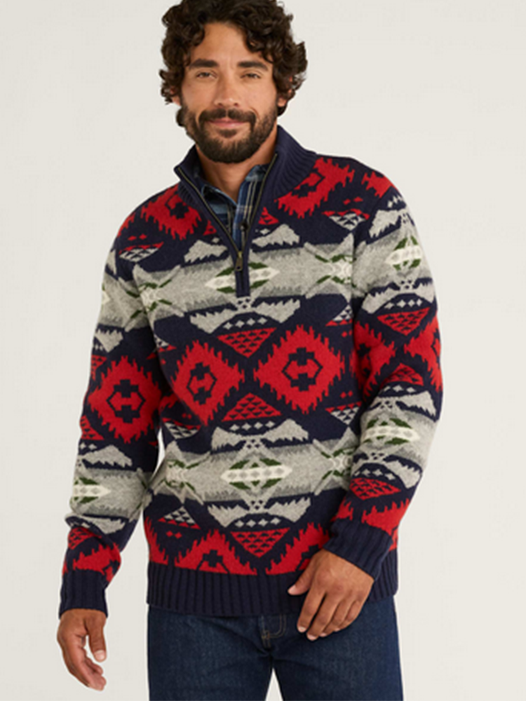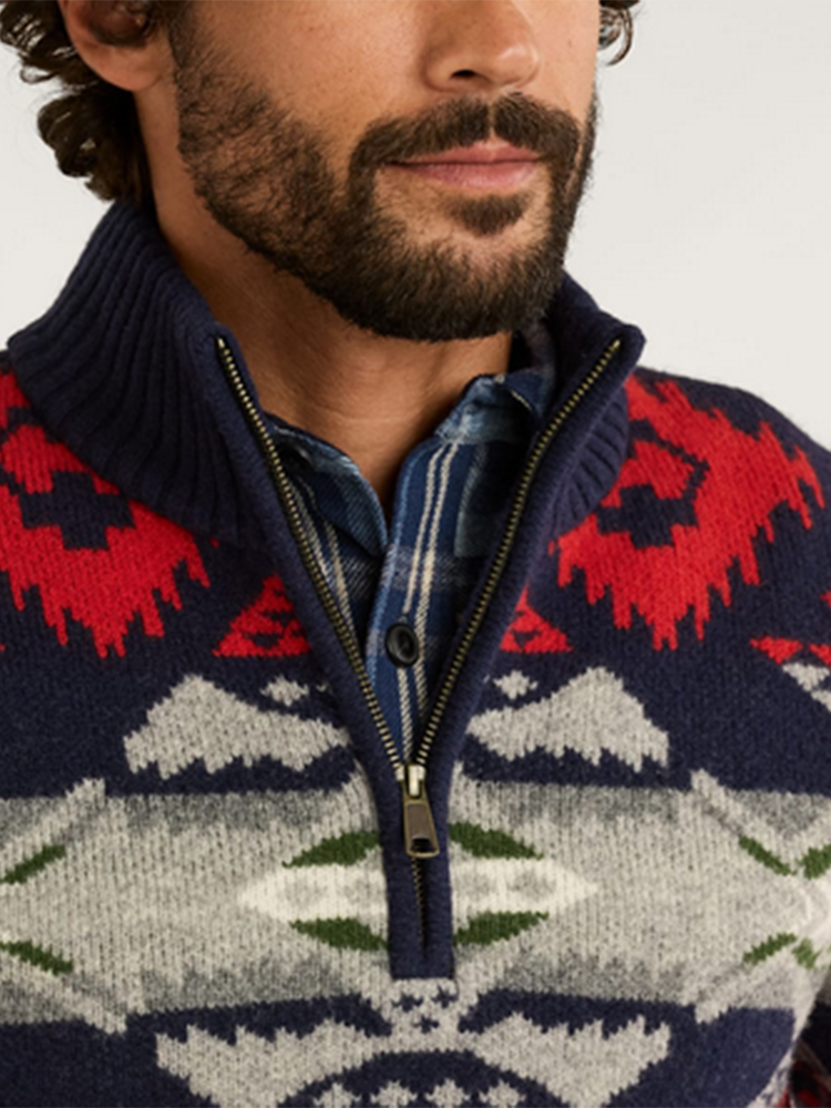 Men's Nehalem Quarter Zip Wool Sweater - MARKED DOWN! This cozy men's cardigan features an allover design drawn from a Pendleton blanket, in a luxury knit of 100% lambswool. Quarter-zip pullover style with leather zipper pull and ribbed stand collar, cuffs and hem.
