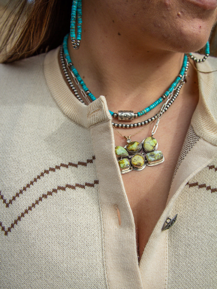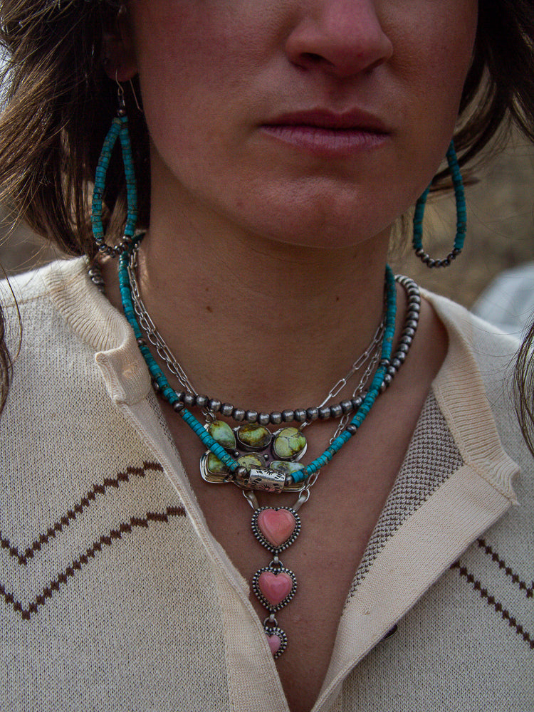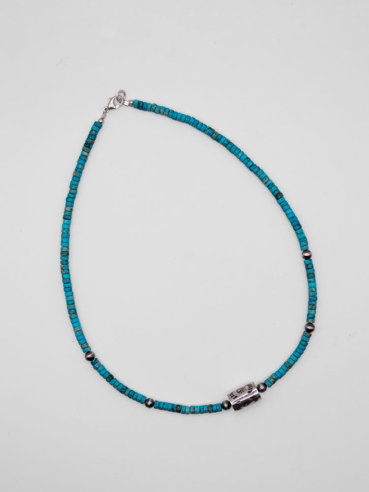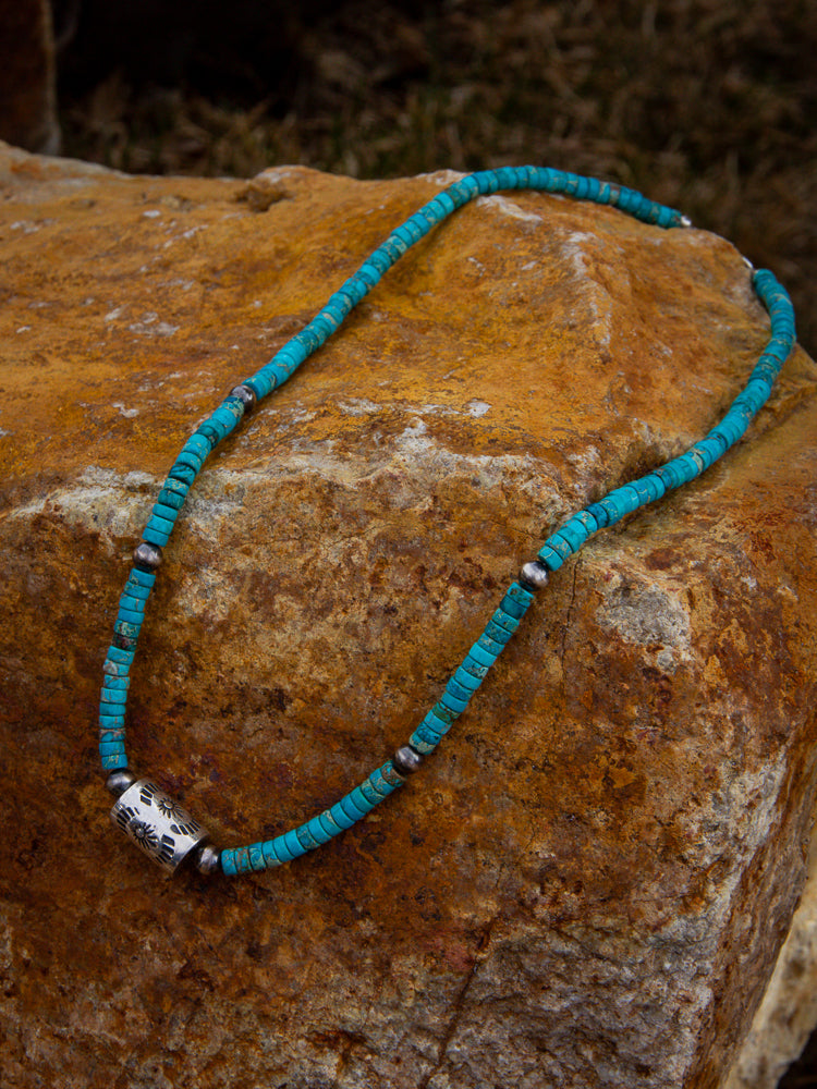 Turquoise Cylinder Necklace - this necklace is beautiful that can wore alone or layered beautiful with others! It has a sterling silver cylinder right in the middle with 5mm navajo pearls spread throughout the turquoise. This piece lays around 16" making it great for layering.
