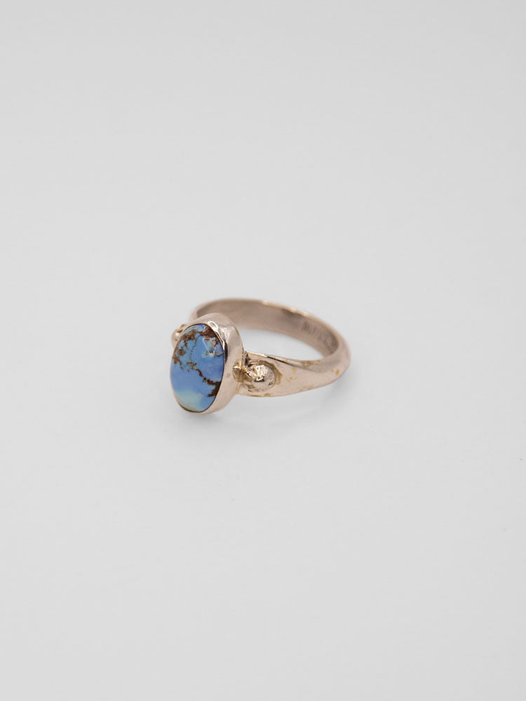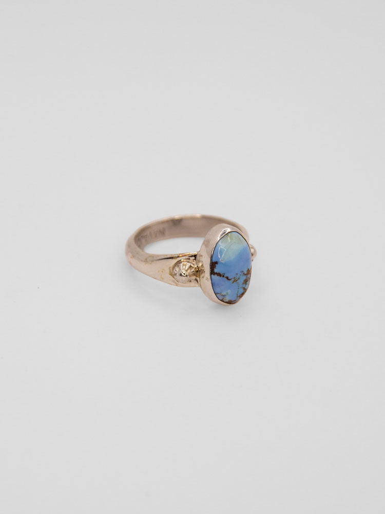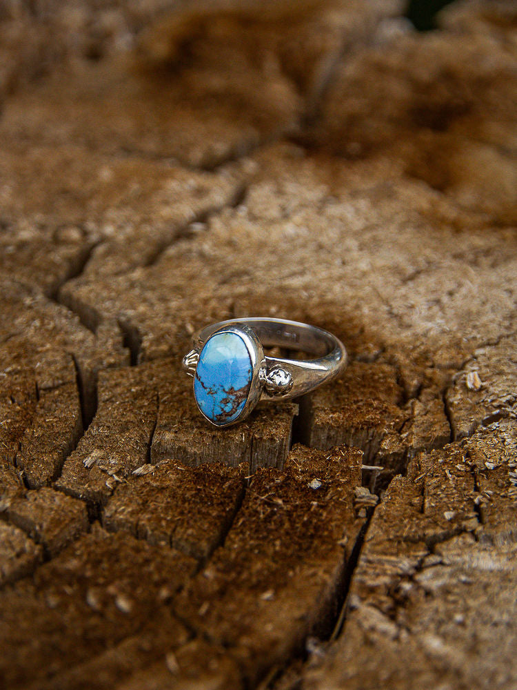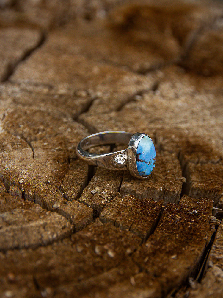 A delicate silhouette with bold beauty — this slender band ring features a stunning Golden Hills turquoise stone, known for its soft blue hues and warm golden matrix. Set in a gracefully slim band, this piece is perfect for stacking or wearing solo as a subtle yet striking statement.