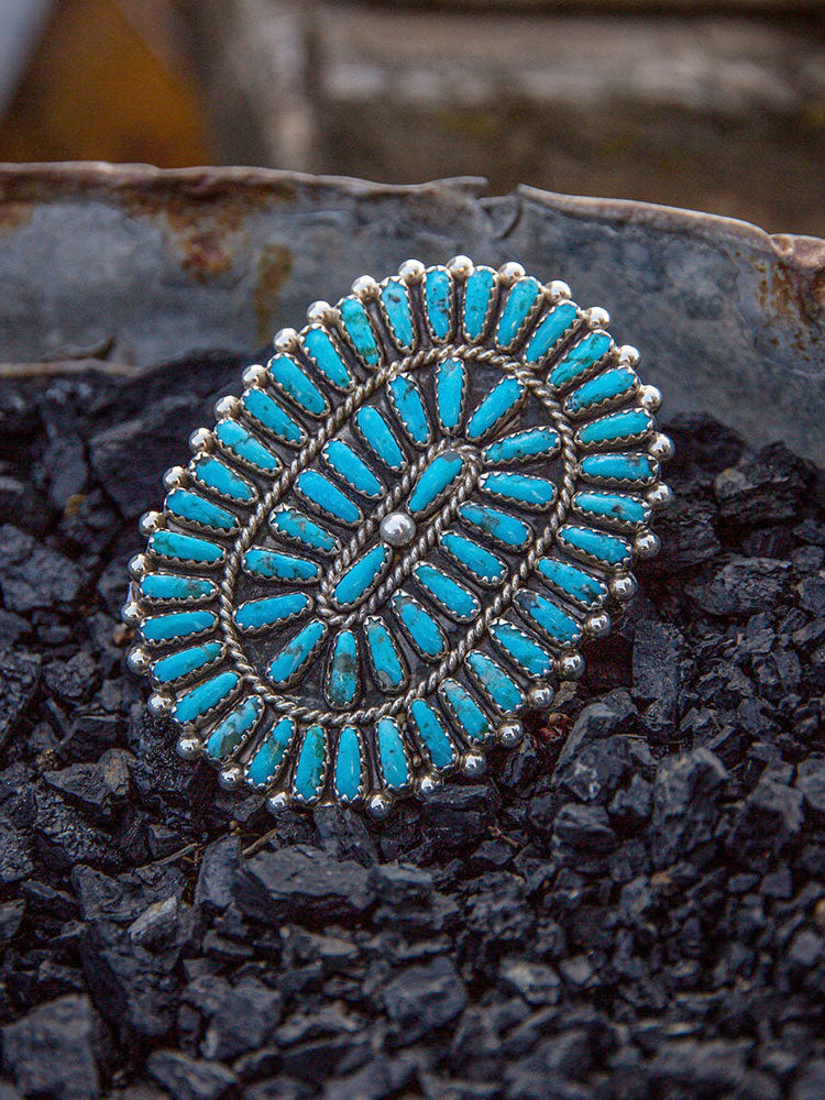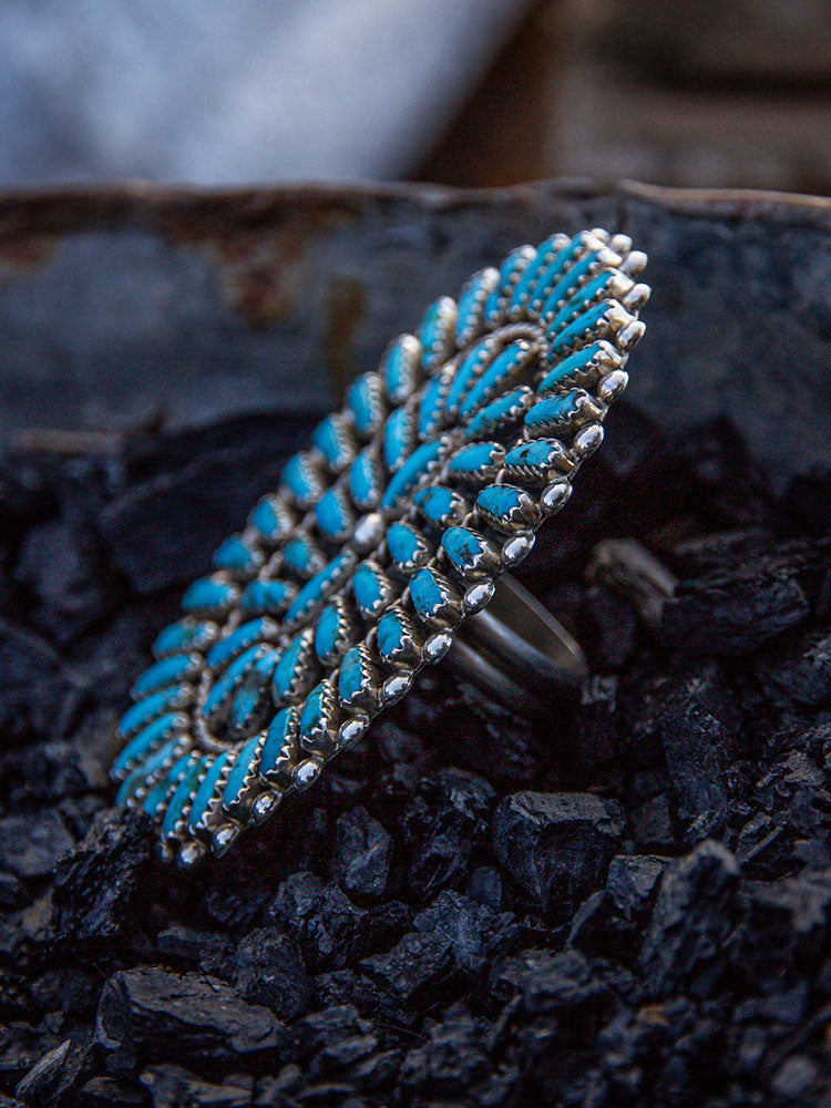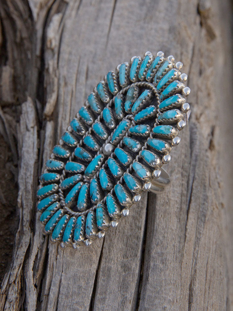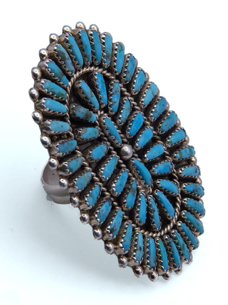 Turquoise Cluster Ring by Philena ByJoe - Classic native look, a real statement ring! Cluster is the term used to describe Zuni-style small stonework: group of small shaped stones that are set close together in individual silver bevels. There are 34 oval teardrop stones around the perimeter, 18 more inside that, and the center has two more with petit point sterling balls on the very outer edge. Measures about 2" tall. Size 9 only.