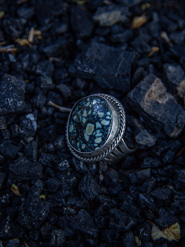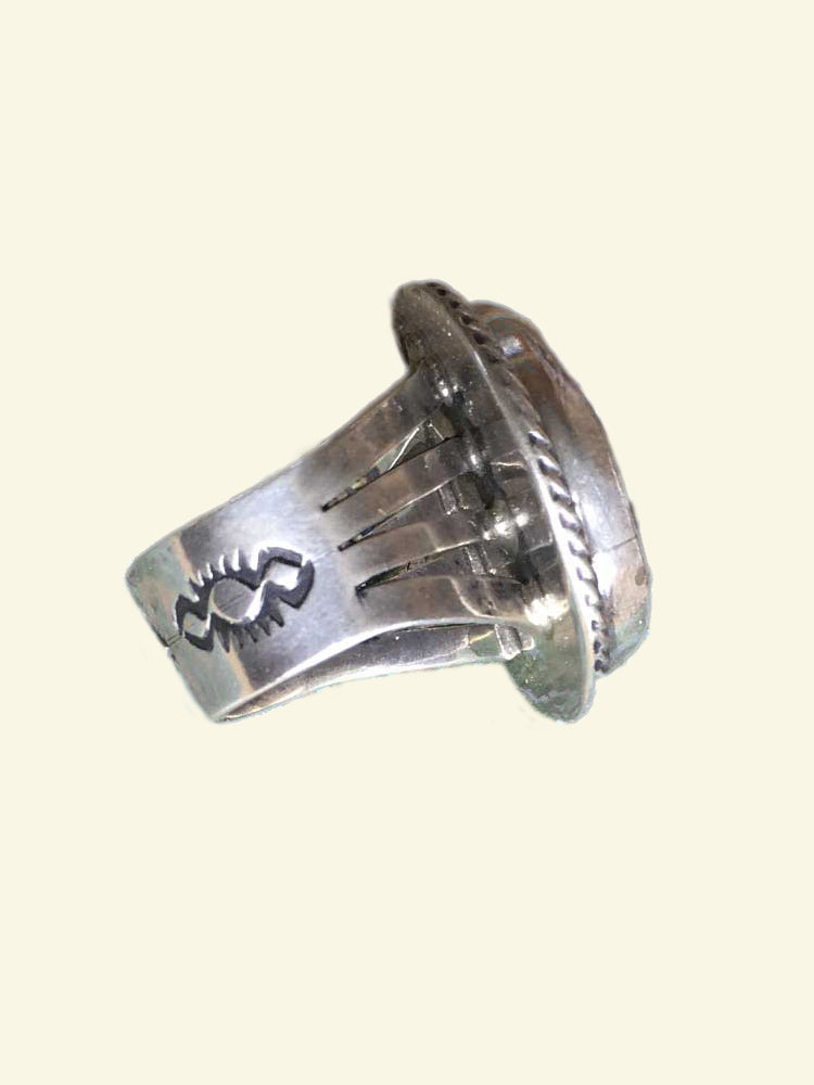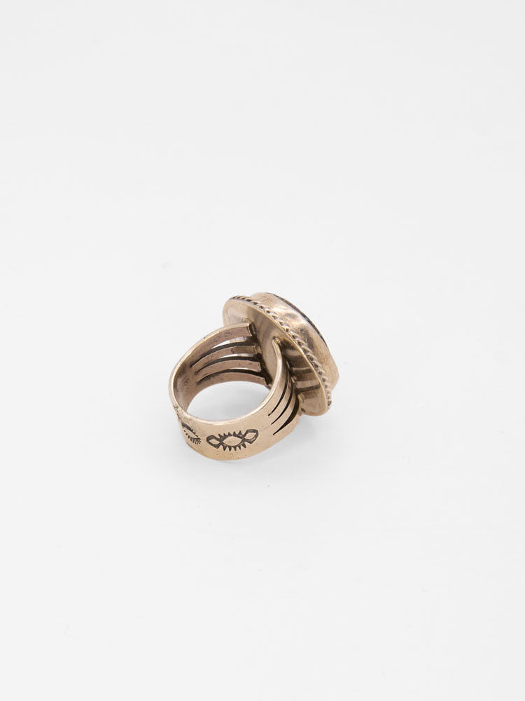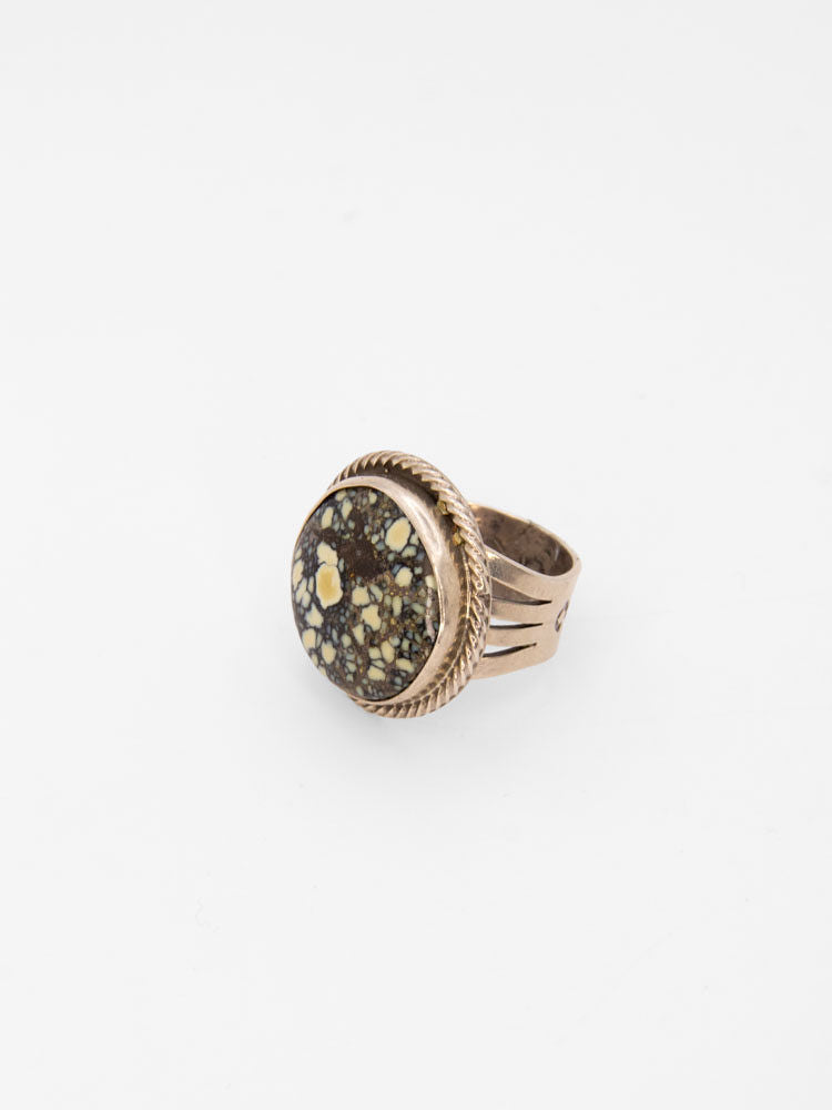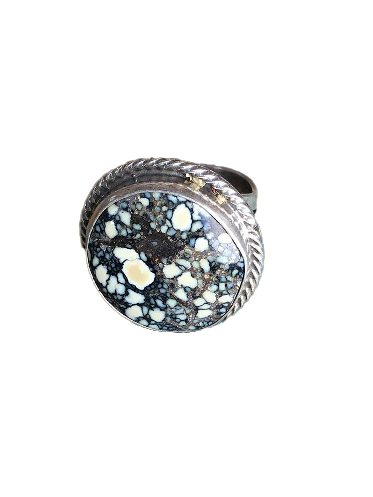 Round 1" Agate Ring of Beautiful Forest Greens + Cremes - Carry the universe on your finger! Swirly imagination-bending matrix and receding and advancing bubbles of colors are amazing in this ring. Rope braid surrounds the slightly elevated smooth surround setting. Beautiful stamping and oxidized work on the wide 4-prong band. Size 7.5.