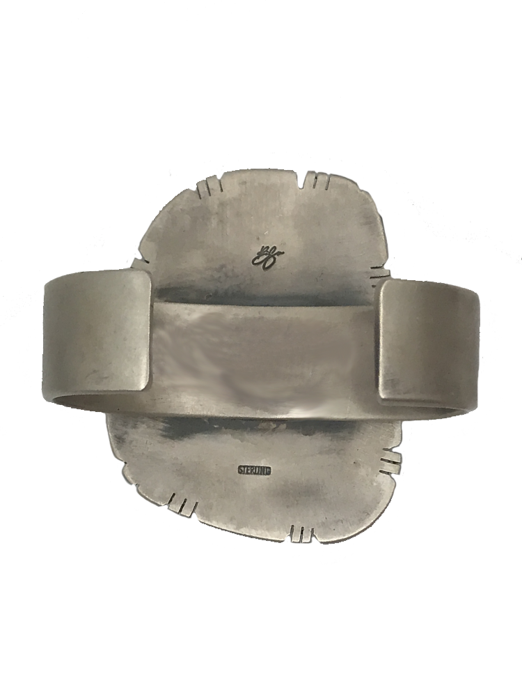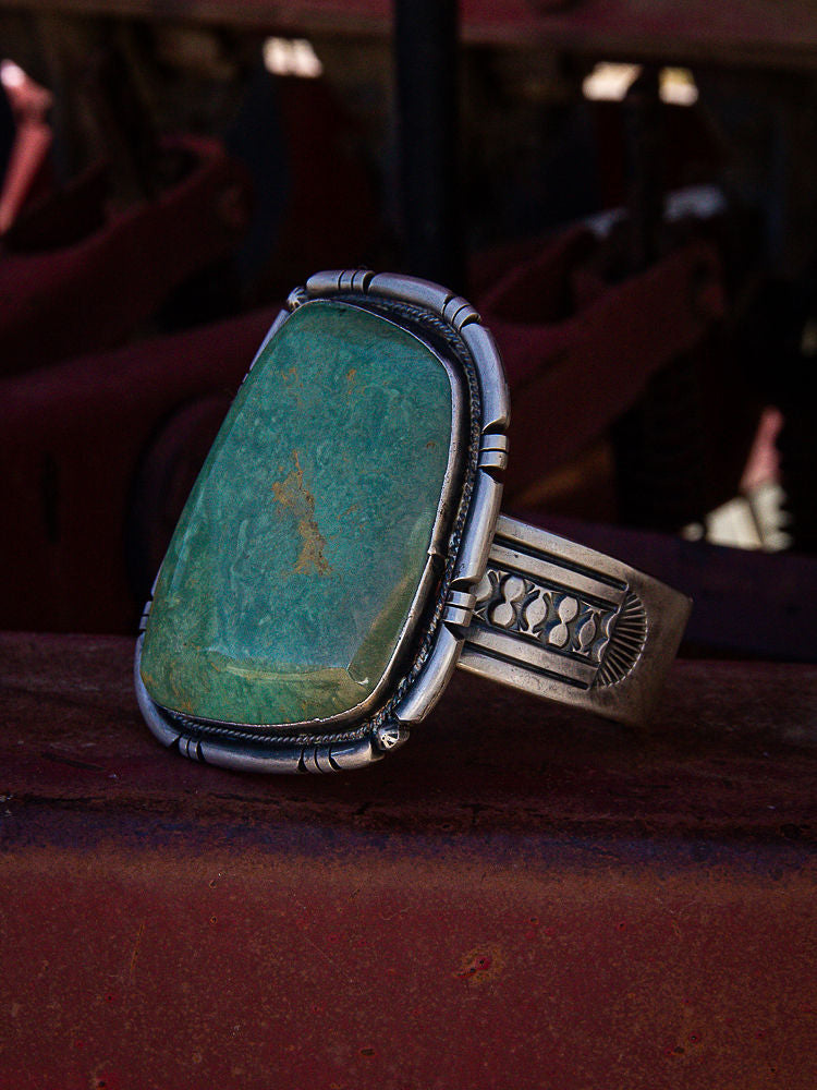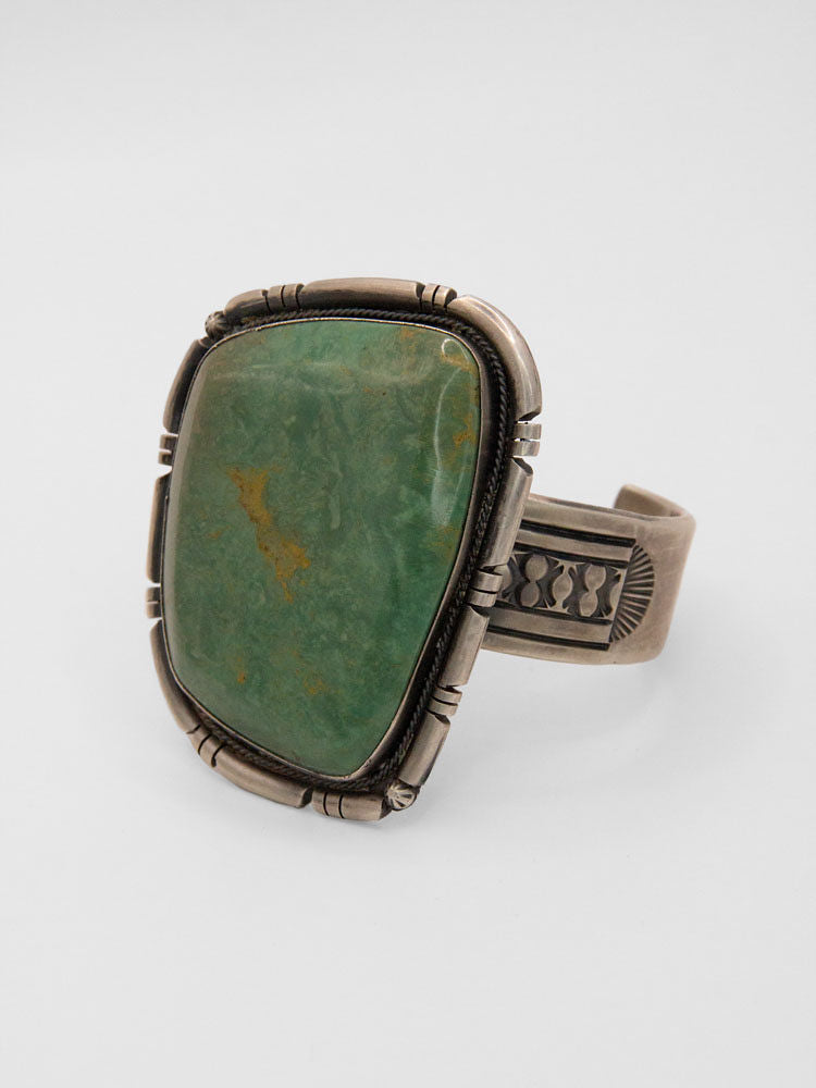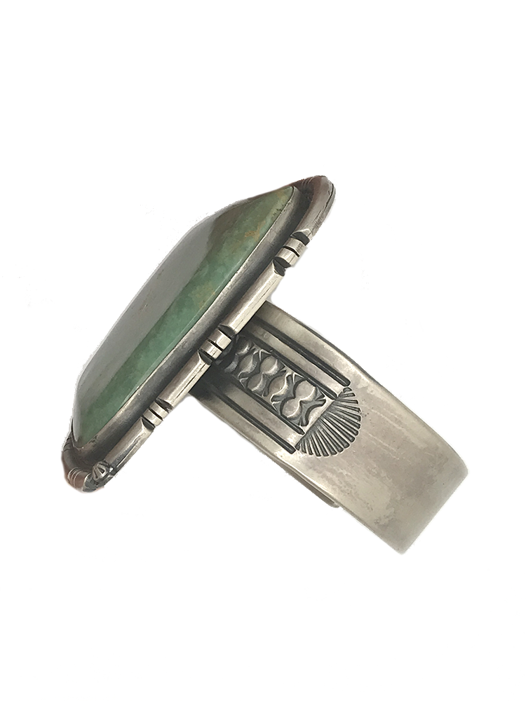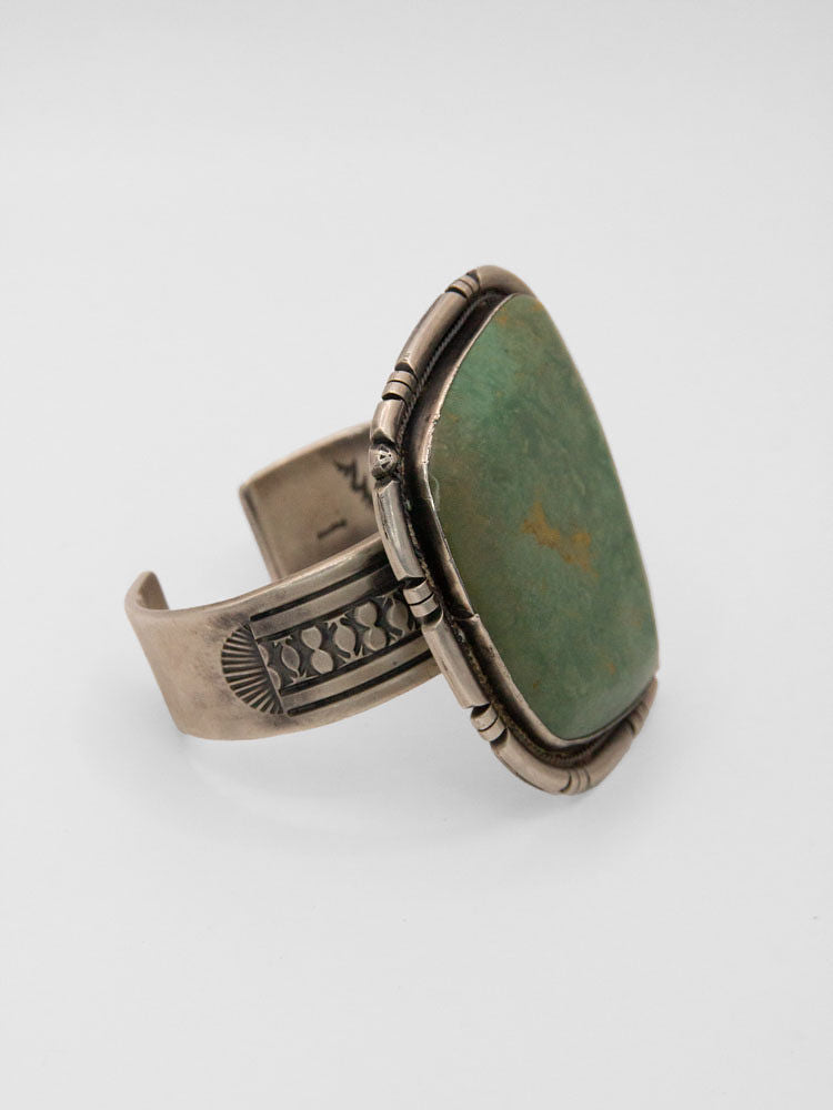 Large Squared Creamy Color Green-Turquoise Cuff - MARKED DOWN! We're talking statement piece! Both the cut and shape of this stone and its segmented rhythmical sterling setting work are exceptional. Slightly asymmetric turquoise squared stone measures a whopping 3" tall x 2-1/4" at its widest, with a most beautiful subtle matrix in a creamy pale green (actual color is even lighter than these photographs), with central tan bit. All sterling cuff with expert stamping. Cuff height is 3/4" tall. Opening is generous: 2-3/4 x 1-3/4" but can be slightly heated to close it up for smaller wrists. Superb craftsmanship. Stamped by artist on the back.