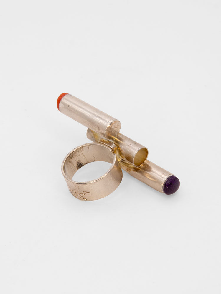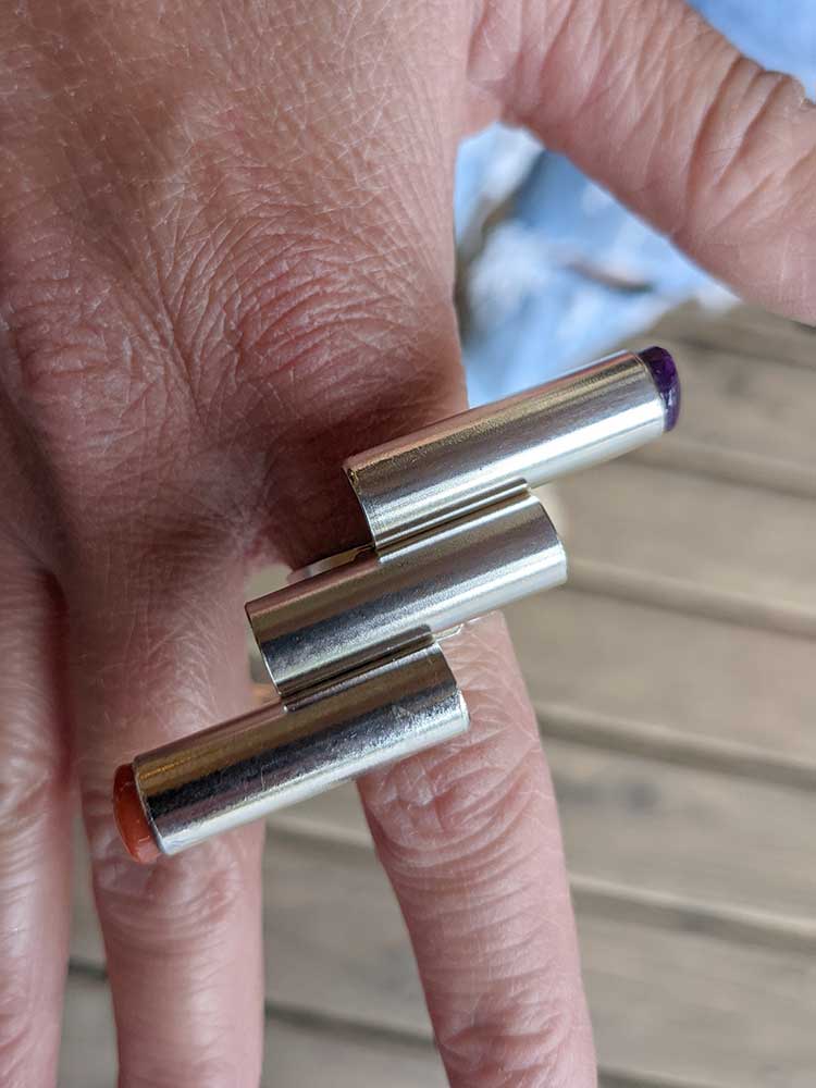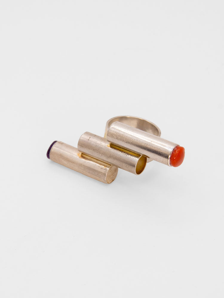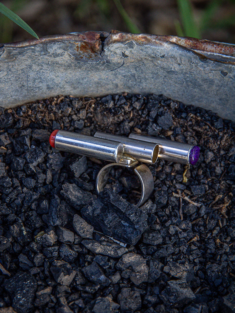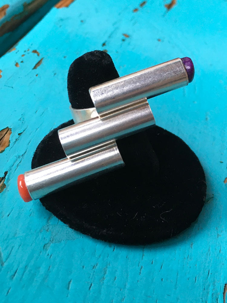Rodney Coriz Tube Stone + Sterling Ring - MARKED DOWN! Rodney Coriz from Santa Domingo Pueblo in New Mexico creates another one-of-a-kind piece in this amazing design. Three tubes seem to float over your hand. The middle tube is open and the other two are capped, one with sugilite, the other coral. Subtle yet bold! Exquisite assembly, made from finest sterling silver. Stamped with his logo. The ring is size 8.