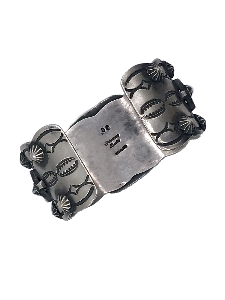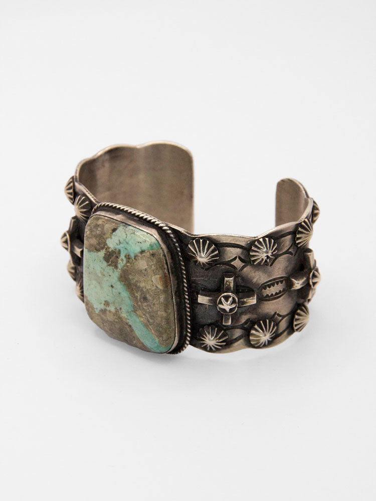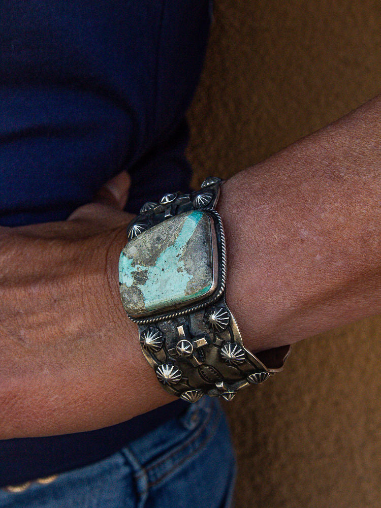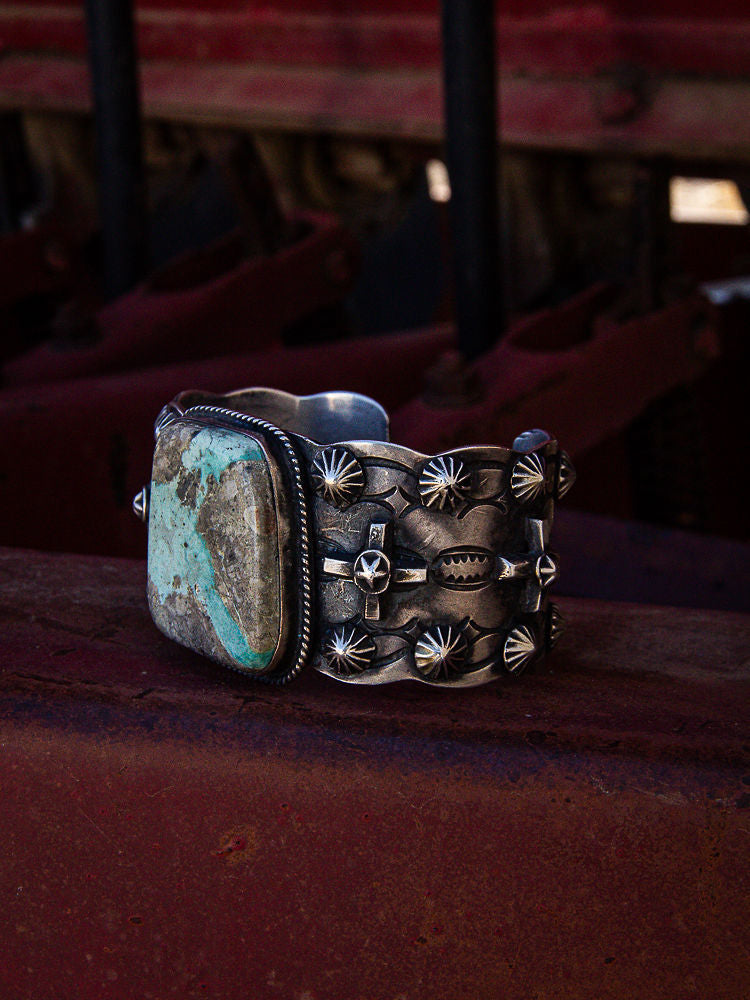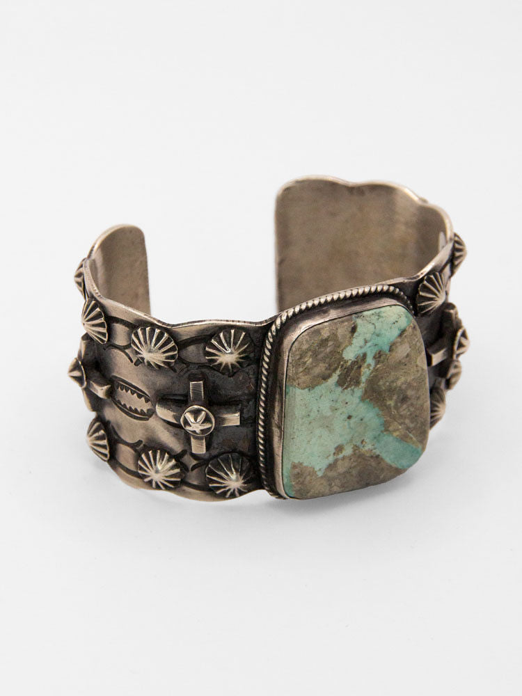 Unique Turquoise Cuff with Silver Conchos + Crosses - MARKED DOWN! We're talking statement piece! Both the cut of this stone and its sterling work are exceptional. Slightly asymmetric turquoise stone measures 1-1/2" tall x 1-1/4" at its widest, with a most beautiful pattern and matrix. All sterling cuff with three rows of constructed, very three-dimensional conchos and concho-centered crosses, in the middle row. Almost medieval royalty feeling! Silver parts have oxidization in the patina. Cuff height is 1-3/8" tall. Opening is generous: 2-1/2 x 1-1/2". Superb craftsmanship. Stamped by artist on the back.