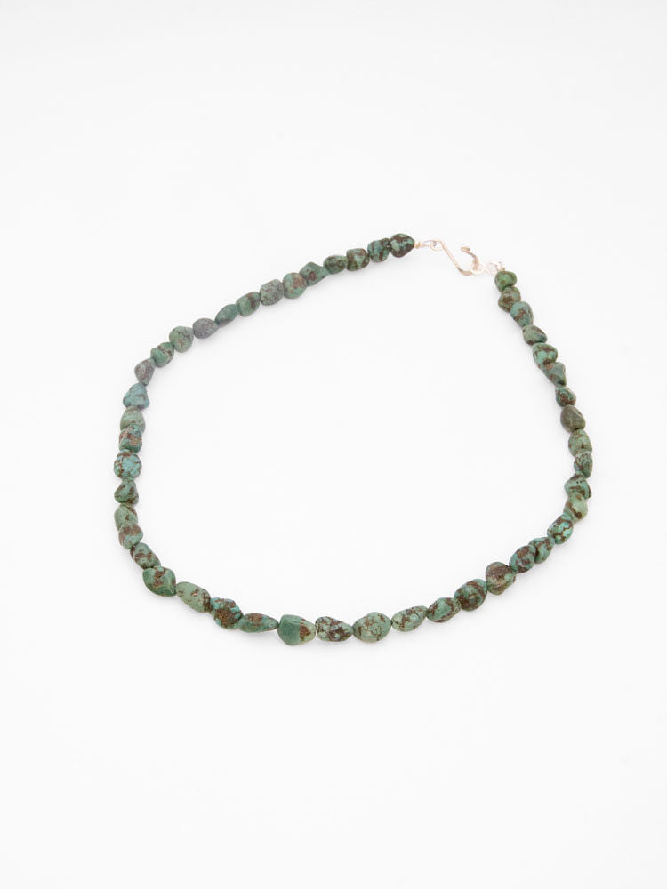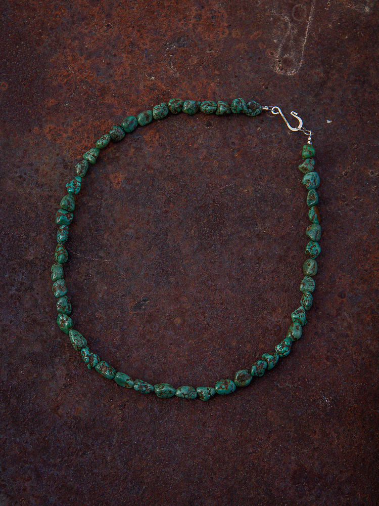 16 + 18" Turquoise Beads Necklace - Smooth oblong natural shaped turquoise beads are strung for a classic native necklace that mixes and matches well with Navajo Pearls of all lengths and sizes. Extended adjustable chain increases length. Native made by Fannie Garcia in New Mexico, USA. They come in green or bluer turquoise.