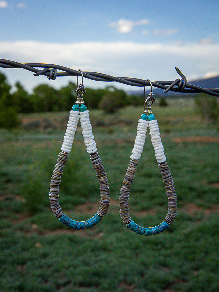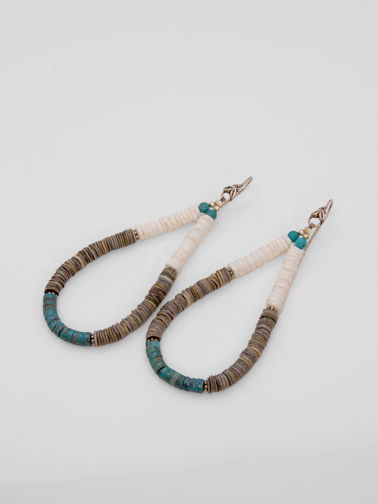 Long Heishi Shell Earring by Paige Wallace - Classic native-American-inspired thinly wafered beads called heishi are the stars in these earrings, with warm gray, white and turquoise colors of shell and stone. Four teeny sterling spacers are in there too. Measures 3.5 inches long and about 5mm diameter on beads. On French wires, and the overall look of these earrings on is fabulous! Paige uses natural US-sourced turquoise and other semi-precious stones to create a unique and very affordable look.