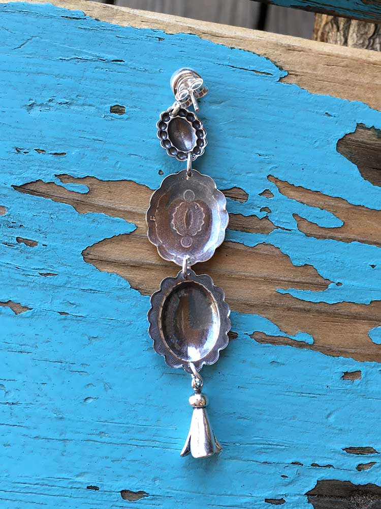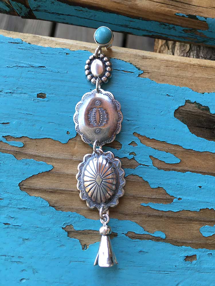 Long Sterling Conchos Earrings by Paige Wallace - These post earrings have a circle turquoise stud to start, and then the fun begins! A small concho is linked with two larger oval conchos, decorated with stamping and embossing differently, and the finial is a darling squash blossom fluted flower. They measure 3" long and are very lightweight. Great detail! Paige uses natural US-sourced turquoise and other semi precious stones to create a unique but very affordable look. (352a)