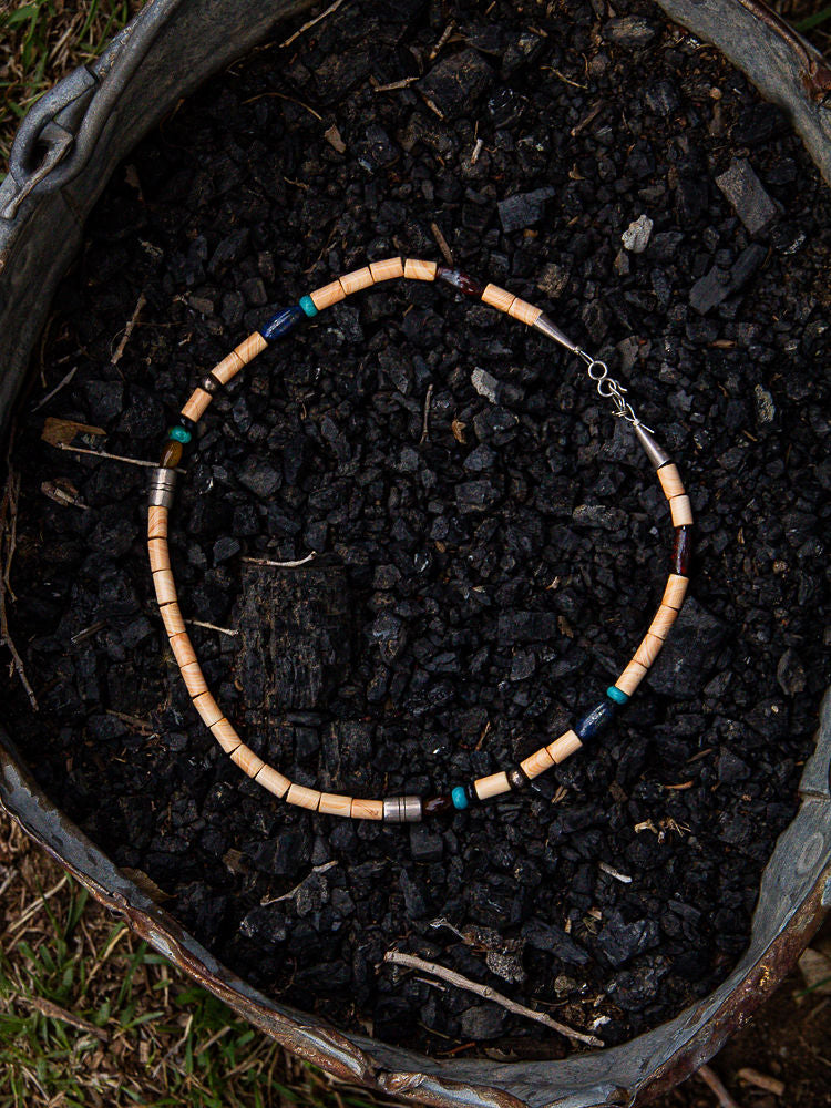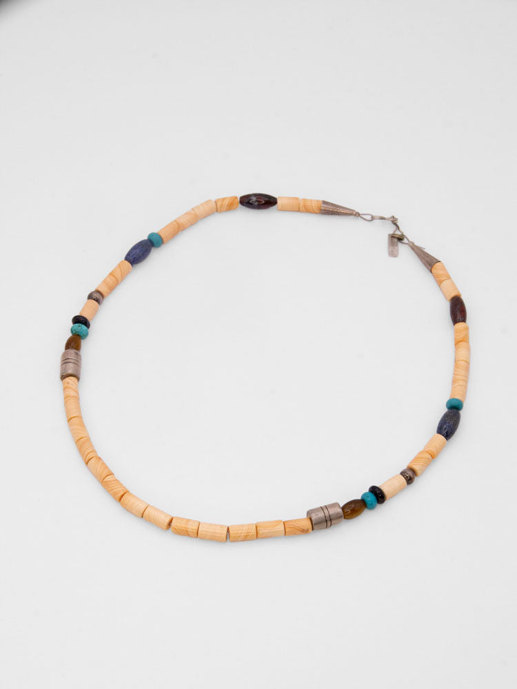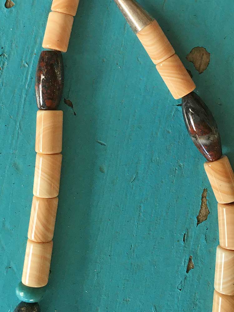 16" Tommy + Rosie Singer Necklace: Smooth Pale Barrel Beads - Rosie Singer carries on their signature look with a mini-version of their usual work: two sterling barrels (the stamp is on the barrel), and a lineup of elongated and barrel round-edged spiny oyster beads, some jasper, some lapis, small turquoise presence too, all similar diameter, for a uniform feel but with the dramatic contrast of light and dark. A subtle masterpiece to wear!