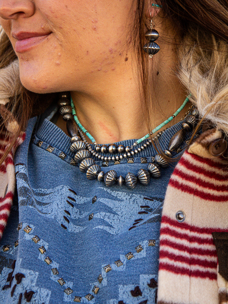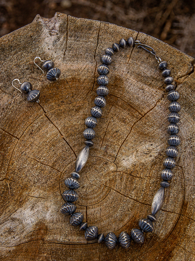 Virginia Tso 20" Pearl Set - this is a beautiful handmade navajo pearl set made by Virginia Tso. Virginia Tso is a renowned Navajo jeweler out of Pinedale, AZ who has been specializing sterling silver beads since 1970s. These pearls are handmade and sterling silver, the necklace is 20" paired with beautifully crafted earrings to match.