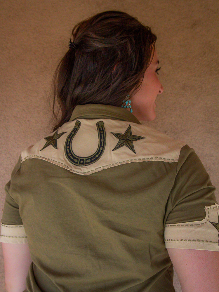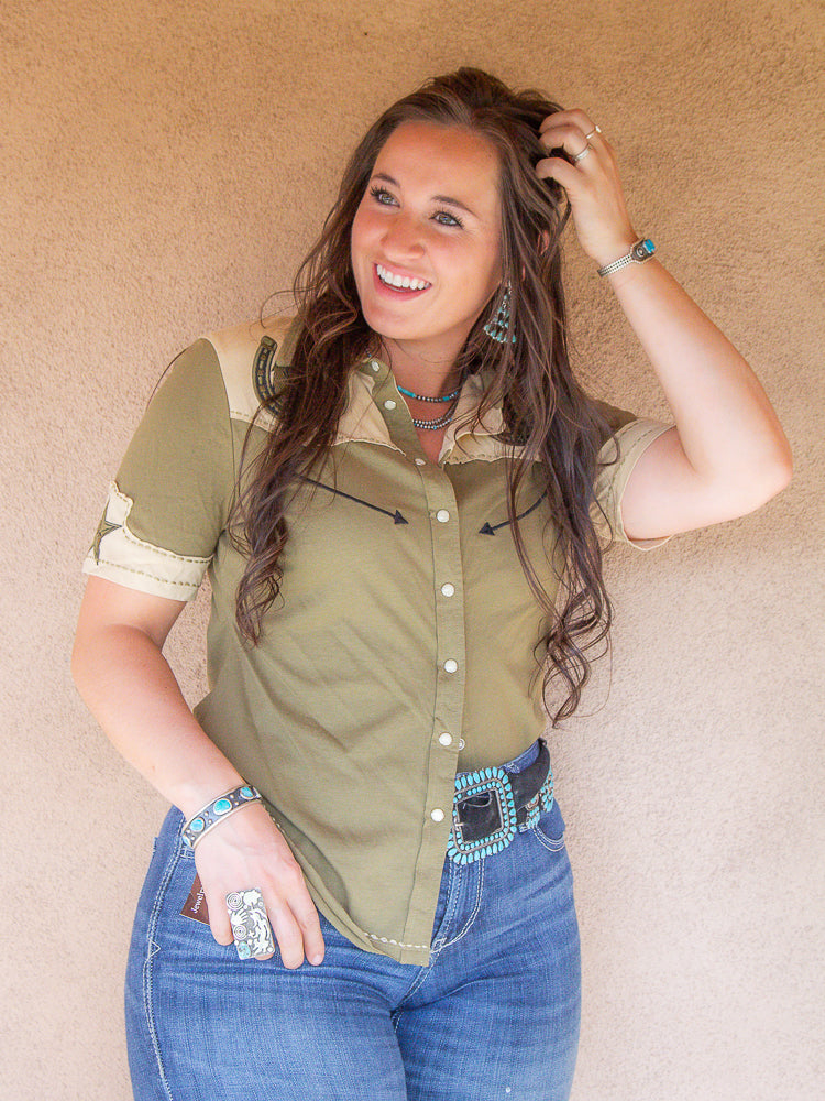 Retro Sage Cowgirl Button Up Top - retro vibes incoming with this top!! This fun top is perfect to wear to the rodeo or another day in the office. Soft sage color paired beautifully with tan and brown inlays topped off with pearl snaps.