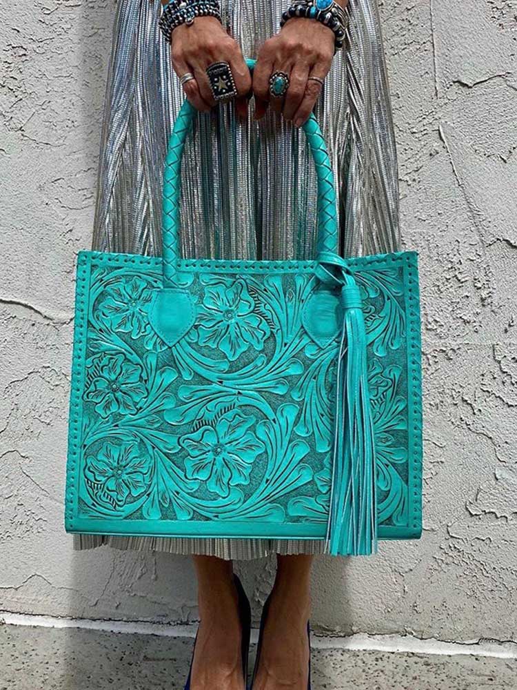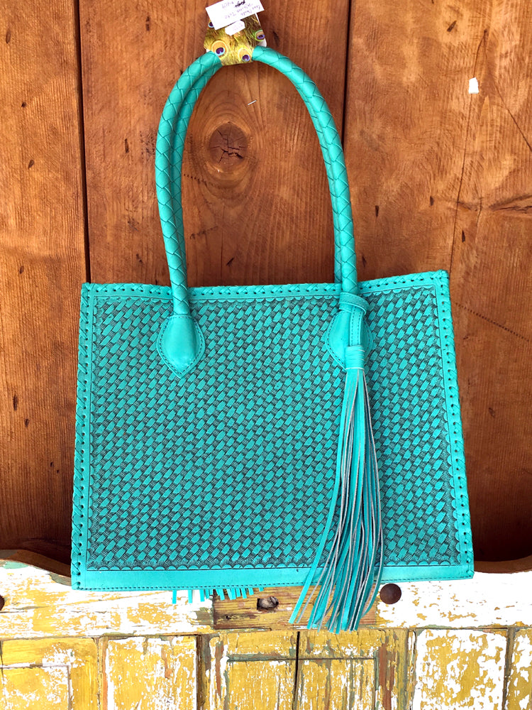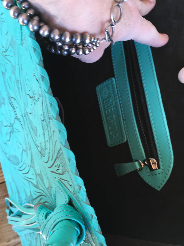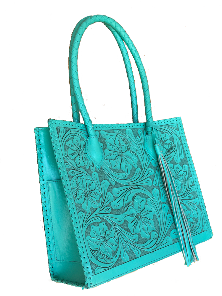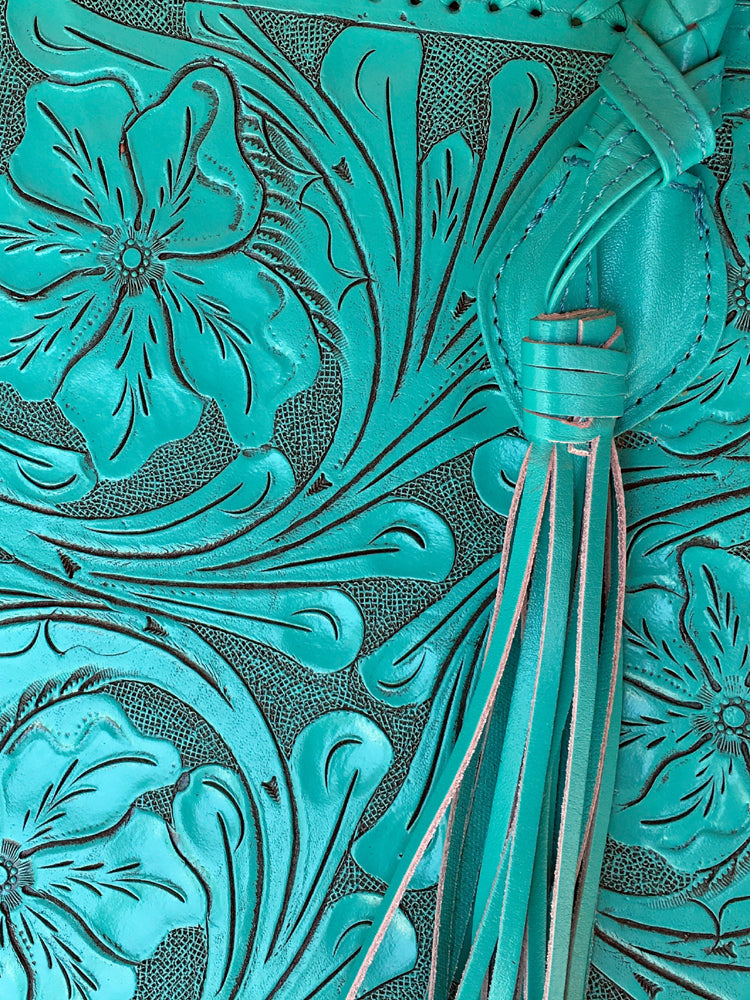 Que Chula! Marcos Large Tooled Leather Turquoise Tote Bag - Que Chula can translate to "what a beauty!" Lovingly made in Mexico, these handbags are the finest leather and tooling, in turquoise shades, since we JLadies LOVE turquoise! Workmanship and details a joy to behold! The Marcos bag measures 14.5" x 12.5" x 5" with a handle drop of 9" and it fits nicely over the shoulder. One pattern for front, another for back, with tassel. Inner pockets: 2 of cloth and one of leather with zipper. Why not just carry EVERYTHING along with you when you can feel so stylish!