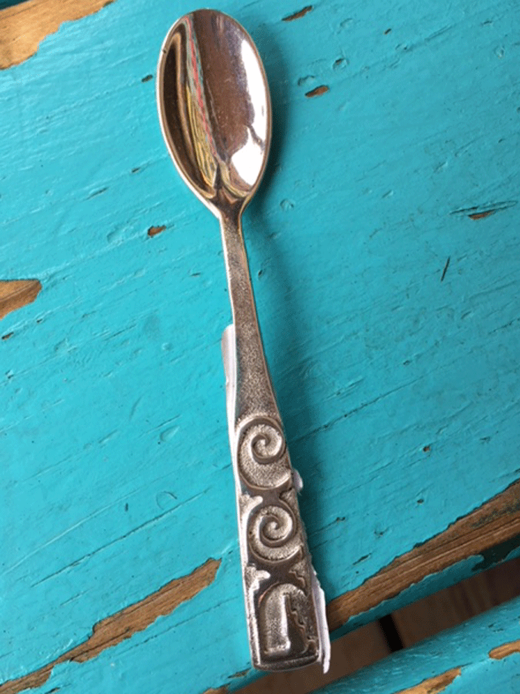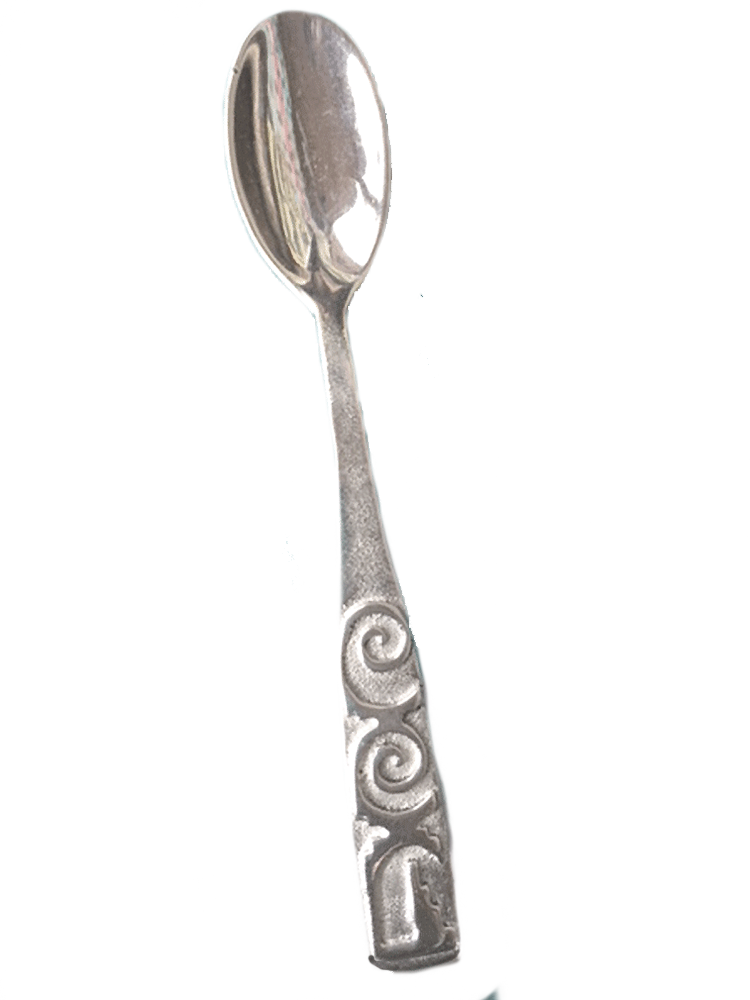 Sterling Baby Spoon with spiral motifs on handle - Handmade keepsakes for baby or for a collection of silver that you enjoy! Measures about 4.25 inches long. Handmade by Navajo nation craftspersons.